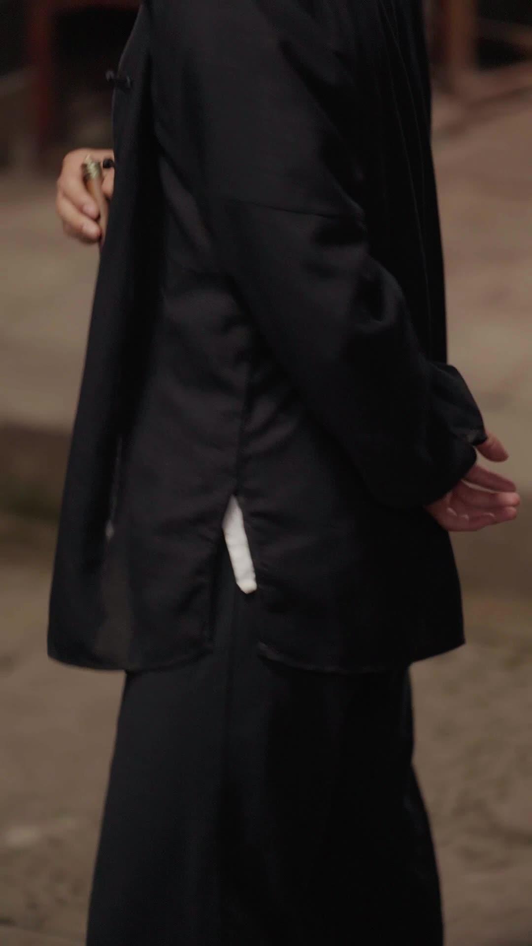 In the dimly lit corridor of what appears to be an old martial arts academy—or perhaps a clandestine guild headquarters—the air hums with unspoken tension. Every wooden beam, every faded scroll on the wall, whispers of legacy, hierarchy, and the weight of tradition. This is not just a setting; it’s a character in itself, breathing through the silence between gestures. And at the center of this charged tableau stands Lin Feng—his posture relaxed yet coiled, his black tangzhuang jacket crisp against the white inner shirt, the frog buttons like tiny sentinels guarding his composure. He doesn’t speak much in these frames, but his eyes do all the talking: sharp, assessing, occasionally flickering with something softer—curiosity? Pity? Or the quiet calculation of someone who knows he’s being tested.