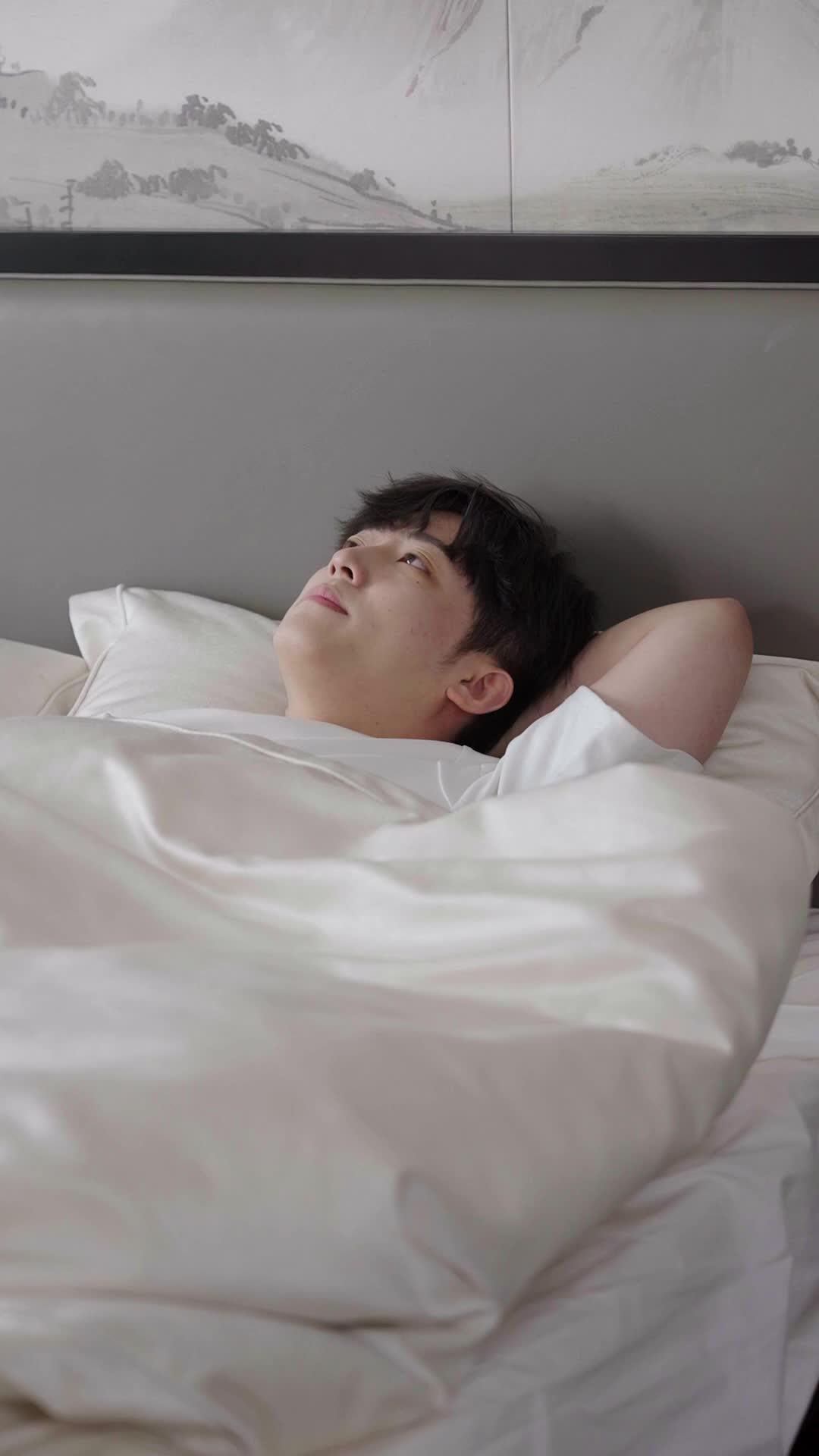 The opening sequence of *Scandals in the Spotlight* is deceptively serene—a young man, Li Zeyu, lies half-buried in ivory silk sheets, eyes drifting upward as if chasing a dream he’s reluctant to abandon. His tousled black hair frames a face still soft with sleep, lips parted just enough to suggest vulnerability. Behind him, a muted ink-wash landscape painting hangs above the headboard—delicate mountains, misty valleys, a world of quiet contemplation. But this tranquility is fragile, like porcelain balanced on the edge of a table. Within seconds, his expression shifts: brows furrow, breath catches, and he jolts upright, fingers clutching the duvet as though it might shield him from something unseen. The camera lingers on his startled gaze—not at the door, not at the window, but *through* them, toward an off-screen presence that has already disrupted his peace.