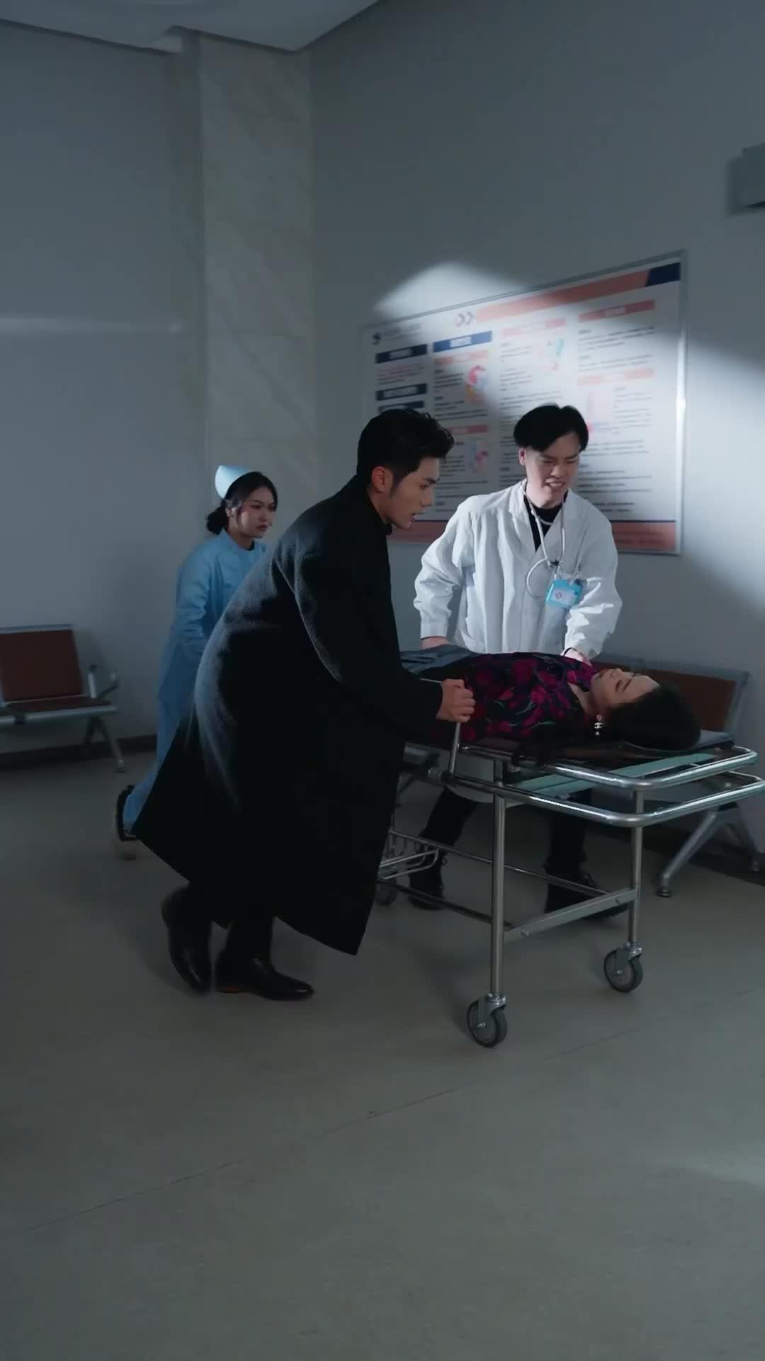 Enter Lin Jian, the man in the black overcoat, gripping the gurney’s metal handle with white-knuckled intensity. His expression is not panic—it’s something deeper, more dangerous: controlled devastation. He doesn’t shout. He doesn’t collapse. He *holds*. His eyes lock onto hers as she murmurs something barely audible, her voice frayed at the edges, as if each word costs her breath. In those close-ups, we see the subtle tremor in her fingers, the way her eyelids flutter—not quite unconscious, not quite present. She’s clinging to awareness, and he’s the anchor she’s refusing to let go of. When he clutches the fabric of her sleeve, twisting it between his fingers like a prayer rope, it’s less about comfort and more about proof: *I’m still here. You’re still here.*