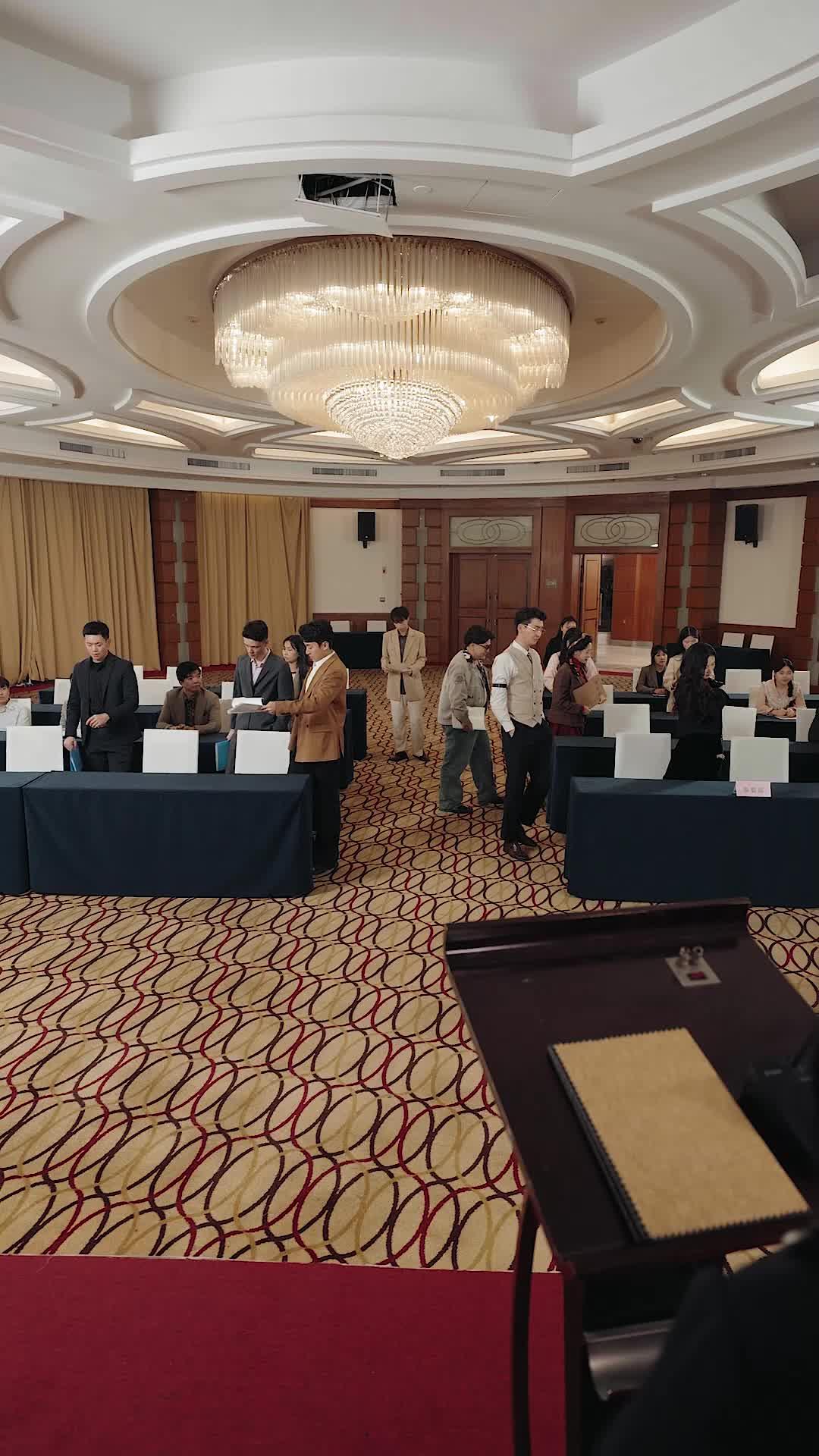 And let’s talk about the set design—because it’s not just background. The carpet’s looping pattern mirrors the characters’ thought processes: repetitive, interconnected, impossible to follow without stepping back. The chandelier? A literal spotlight on illusion—glittering, dazzling, but ultimately hollow unless you look up close. Even the nameplates matter. One reads ‘Participant Group A’ in faded pink ink, another ‘Jiang Yiran’ in bold black—subtle hierarchy encoded in typography. When Lin Zeyu slides his folder forward, the corner catches the light, revealing a faint crease down the middle: he’s opened it before. He’s rehearsed. He’s ready. But Jiang Yiran doesn’t touch hers. She leaves it closed, pristine, as if the act of opening it would break the spell.