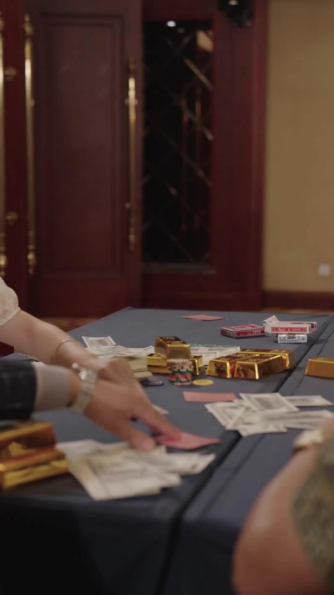 The setting is crucial: a grand ballroom repurposed as a clandestine exchange zone. Redwood paneling, heavy drapes, a service bell placed center-table like a relic from a forgotten empire. This isn’t Vegas; it’s somewhere older, where deals are sealed with eye contact and the weight of silence. The table itself is a tableau: stacks of US hundred-dollar bills, gold ingots stamped with obscure insignias, poker chips in jewel tones, and—oddly—a single pink card face-down. What does it mean? We don’t know. But its presence haunts the scene, like a ghost note in a symphony.
