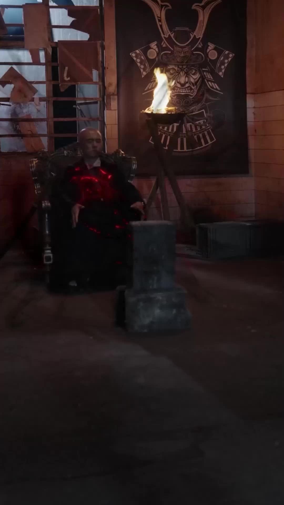 In the dim, smoke-choked chamber where shadows cling like old regrets, *The Barbecue Throne: A Hero's Awakening* begins not with a sword clash or a thunderous declaration, but with a single flicker of flame—held aloft in a rusted brazier beside a bald man draped in black silk and silence. That man is Master Lin, a figure whose presence alone seems to warp time: his throne, ornate and gilded yet cracked at the armrests, suggests power long held but never truly settled. He sits not as a ruler, but as a judge awaiting confession. His first gesture—a slow, deliberate wave of the hand—unleashes a crimson pulse across his chest, as if summoning something dormant within himself. Then, without warning, the stone block before him shatters. Not from impact, but from *intent*. Smoke coils upward like a serpent retreating into memory, and for a moment, the camera lingers on the fractured granite, its surface etched with faint, almost ritualistic markings—characters that vanish when the light shifts. This is no mere set dressing; it’s a language older than speech.