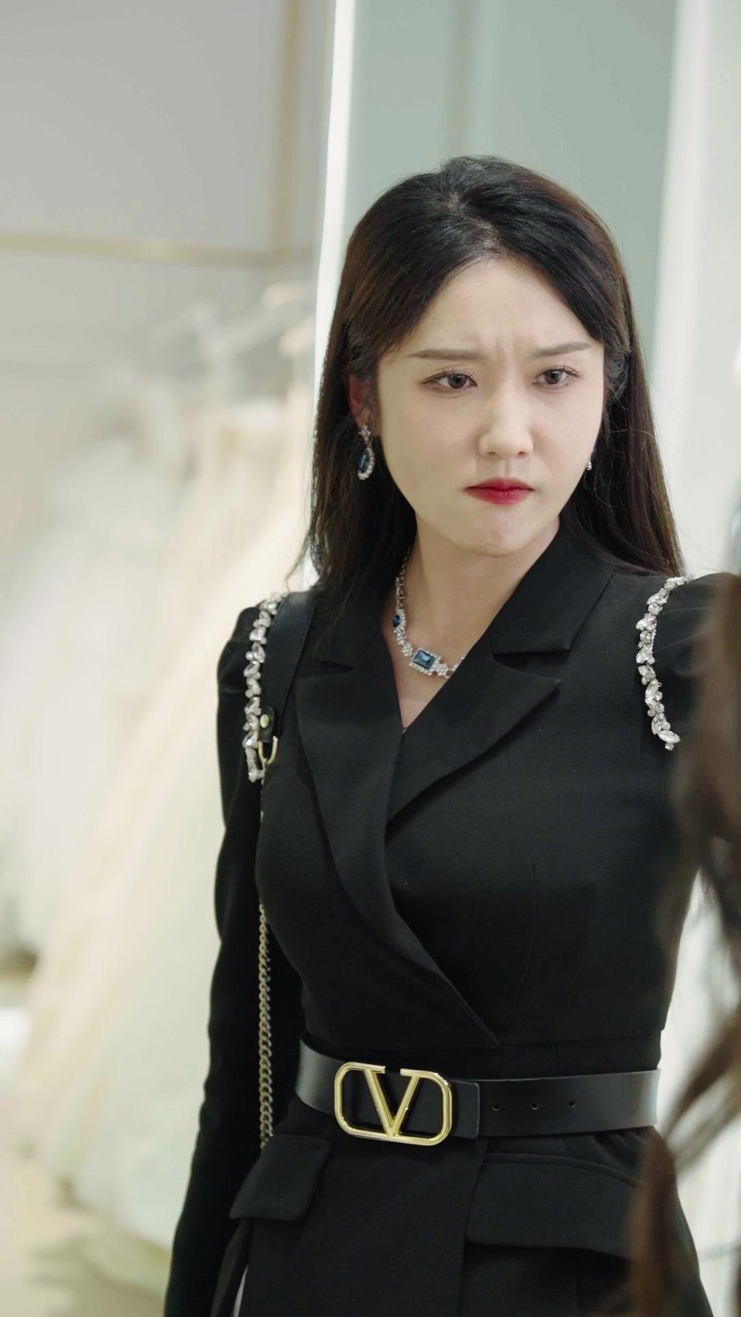 That gold-V belt isn’t just fashion—it’s a power flex. In *Master of Phoenix*, every glance from the black-suit woman feels like a courtroom verdict. Her crossed arms? A silent ‘I’ve seen this script before.’ Meanwhile, the brown-silk one plays emotional whiplash—suspicion, smirk, then full-on laugh. Classic tension-to-comedy pivot. 🎭 #BridalShopDrama