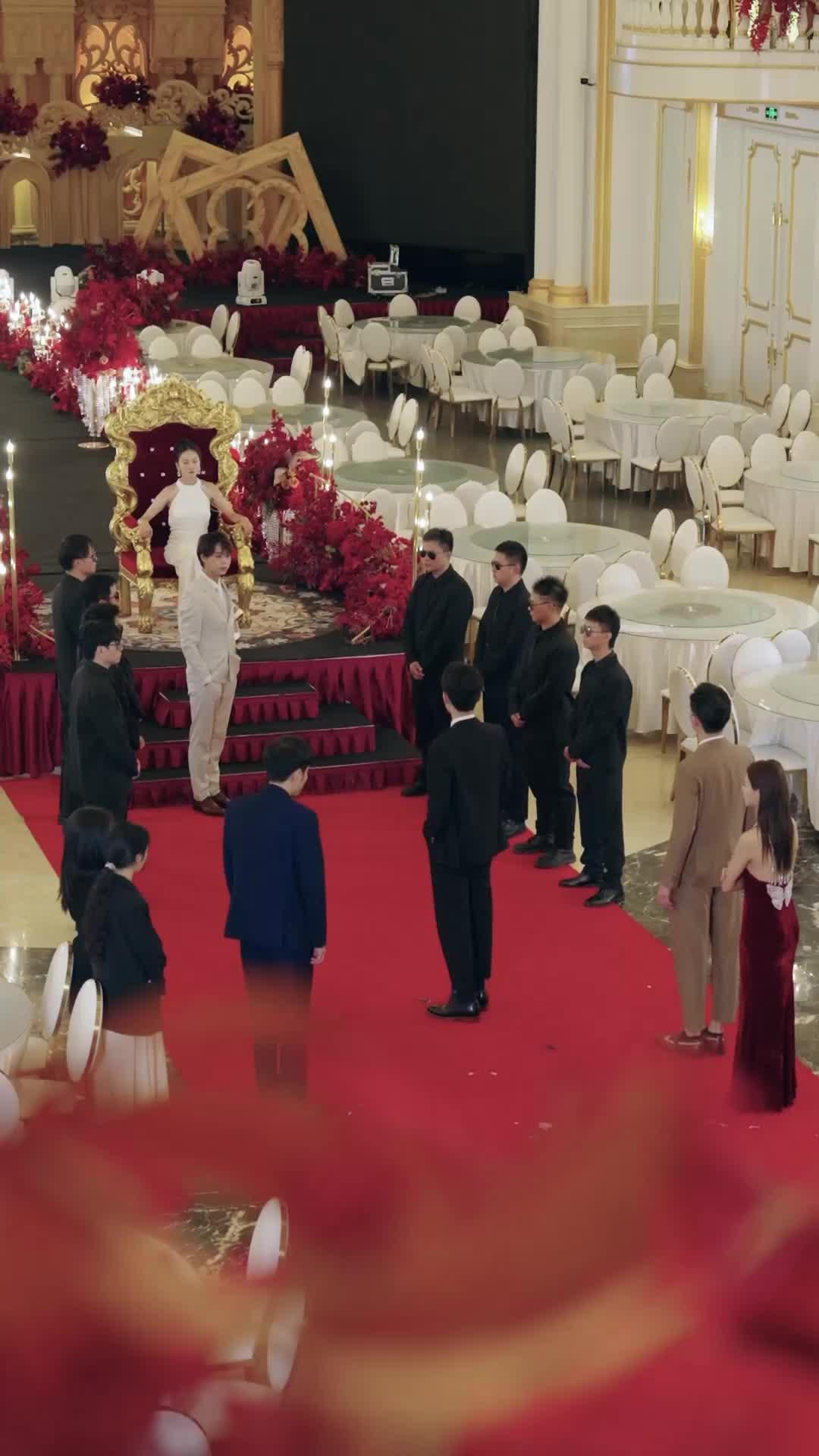 Let’s unpack the setting first, because the venue isn’t just backdrop—it’s complicit. The banquet hall is a cathedral of excess: vaulted ceilings gilded in gold leaf, chandeliers dripping with crystals, round tables draped in ivory linen, each set with silver cutlery polished to mirror-like sheen. Yet none of it matters. The red carpet running down the center isn’t for ceremony—it’s a runway for reckoning. And Lin Xiao doesn’t walk it like a guest. She walks it like a conqueror returning to claim what was stolen. Her white gown isn’t bridal; it’s armor. The sequins aren’t decoration—they’re shards of broken promises, catching light like warning flares. Her hair is pulled back in a tight knot, severe and intentional, framing a face that refuses to betray emotion. Even her earrings—those delicate white floral drops—are asymmetrical, one slightly lower than the other, as if she deliberately disrupted perfection to remind everyone: *I am not what you remember*.