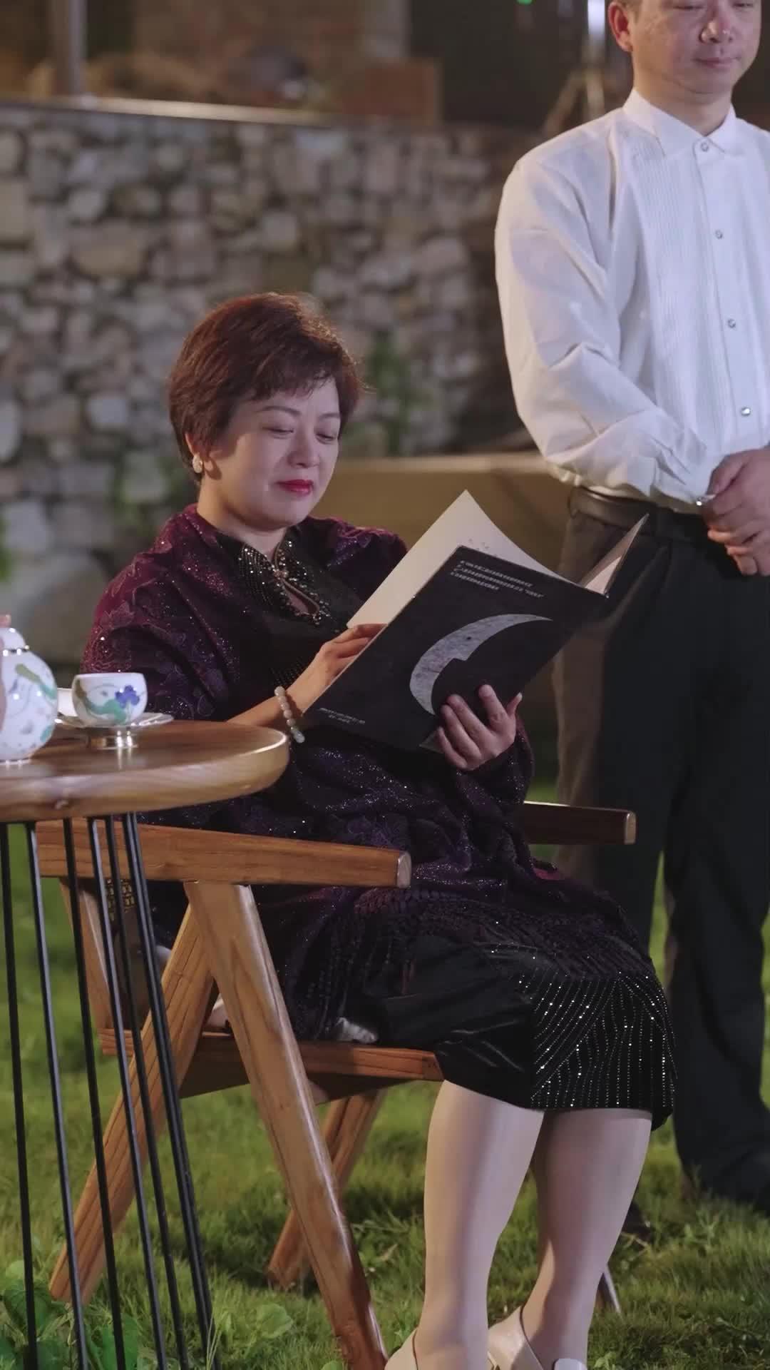 There’s a particular kind of tension that only exists in spaces where elegance masks eruption—and *The Billionaire Ex-Wife Strikes Back* captures it with surgical precision in this nocturnal garden standoff. The setting itself is a character: manicured lawn, low ambient lighting spilling from hidden fixtures, a stone wall that looks both protective and prison-like. At first glance, it’s serene. A woman reads. A servant pours tea. Two men stand respectfully aside. But anyone who’s ever attended a high-society gathering knows: the quieter the surface, the deeper the current beneath. Lin Mei, seated with regal poise, holds a book whose cover features a stark silver crescent moon against black—a visual metaphor so obvious it’s almost cruel. She flips a page slowly, deliberately, as if savoring the last moments before the dam breaks. Her makeup is immaculate, her short auburn hair styled with military precision, yet her eyes betray fatigue. Not physical exhaustion, but the kind that comes from carrying secrets too long. When the teapot lifts, pouring amber liquid into a floral-patterned cup, the stream is steady—but her knuckles whiten around the book’s edge. She’s bracing.