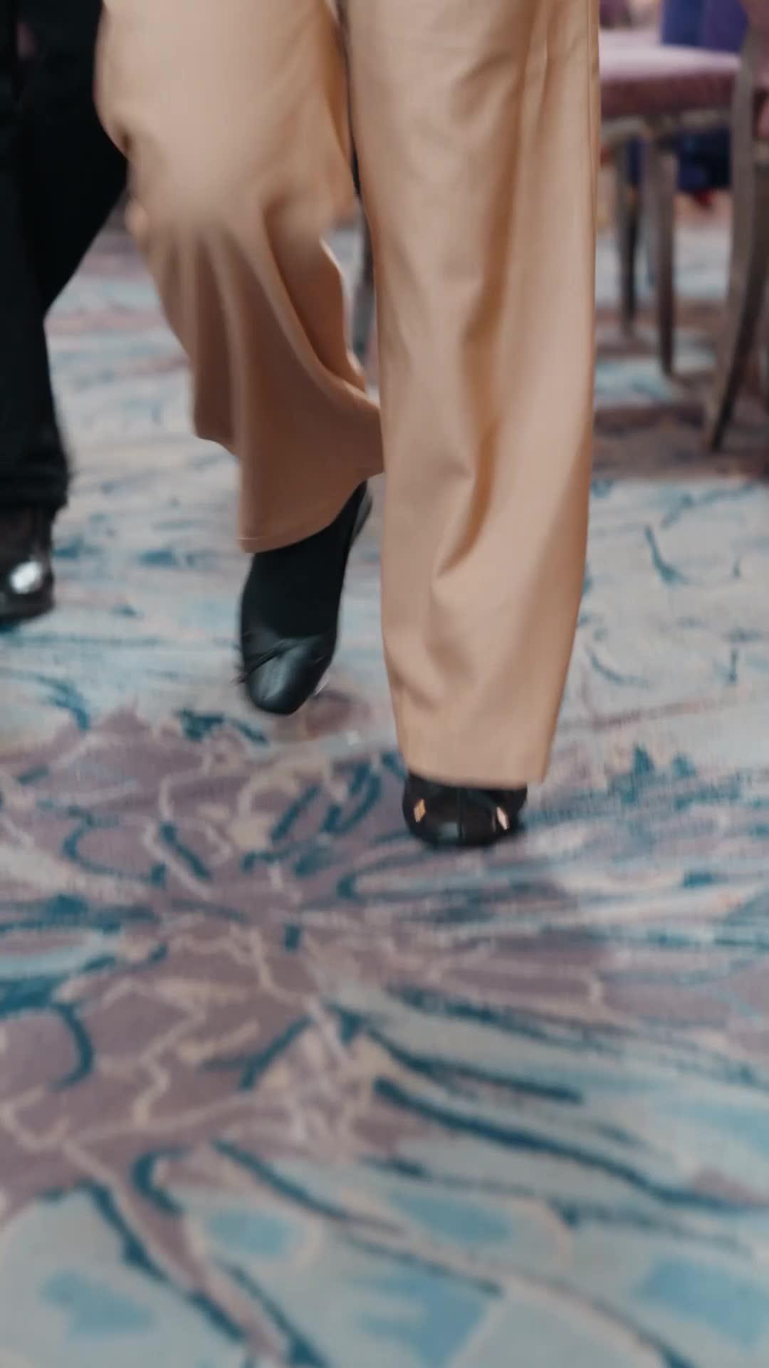 The opening frames of *The Billionaire Heiress Returns* do not begin with fanfare or a grand entrance—they begin with feet. Not just any feet, but those of a woman in tailored beige trousers and glossy black loafers, each step deliberate, unhurried, yet carrying the weight of unspoken authority. The camera lingers on the carpet’s swirling blue-and-ivory pattern, as if the floor itself is trying to absorb the tension she leaves in her wake. Behind her, another pair of shoes—dark, polished, slightly less confident—follows at a respectful distance. This is not a chase; it is an escort. A silent acknowledgment of hierarchy. The visual grammar here is precise: power does not announce itself with volume, but with rhythm, with spacing, with the way fabric falls just so over the calf. The beige suit, later revealed in full, is neither flashy nor austere—it is *strategic*. Its double-breasted cut frames her posture like armor, while the black-and-cream monogrammed scarf draped across her chest functions less as accessory and more as heraldic banner: this is not just a woman, but a lineage, a brand, a legacy stitched into silk. Her red lipstick is not bold—it is calibrated. It matches the urgency in her eyes, but never overpowers them. She walks not toward a crowd, but *through* it, parting the sea of men in suits like Moses through the Red Sea, except here, no one parts willingly. They shift, they glance, they hesitate. One young man in a charcoal suit flinches almost imperceptibly as she passes—his shoulders tighten, his gaze drops. He knows he’s being assessed. And he fails, silently.