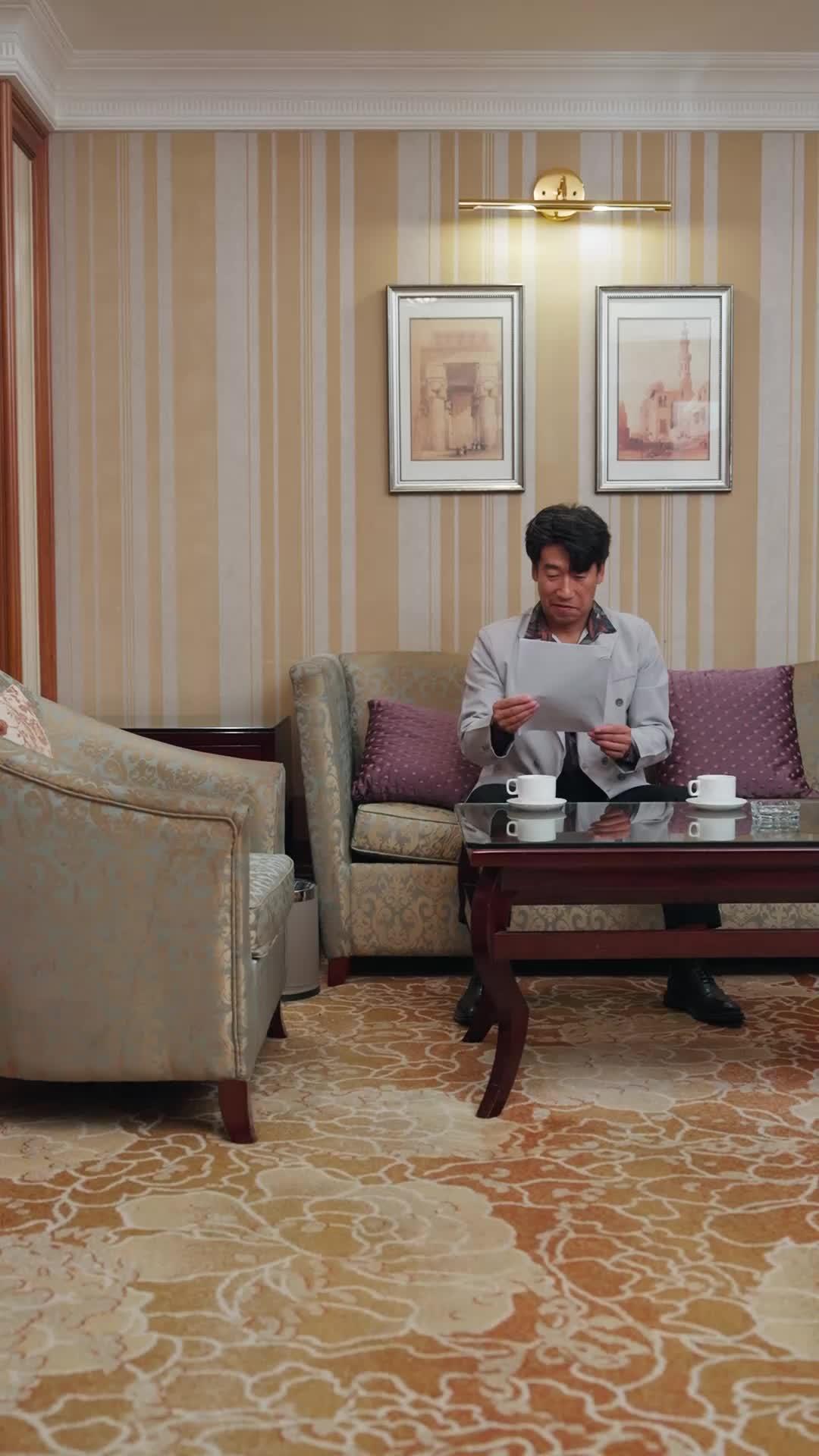 Let’s talk about what just unfolded—not as a plot summary, but as a slow-motion psychological ambush disguised as a tea break. The setting is opulent, almost theatrical: striped wallpaper, gilded sconces, ornate armchairs with floral upholstery, and a glass-top coffee table that reflects every gesture like a silent witness. This isn’t just a hotel lounge—it’s a stage where power dynamics are negotiated not with raised voices, but with the tilt of a teacup and the hesitation before turning a page.