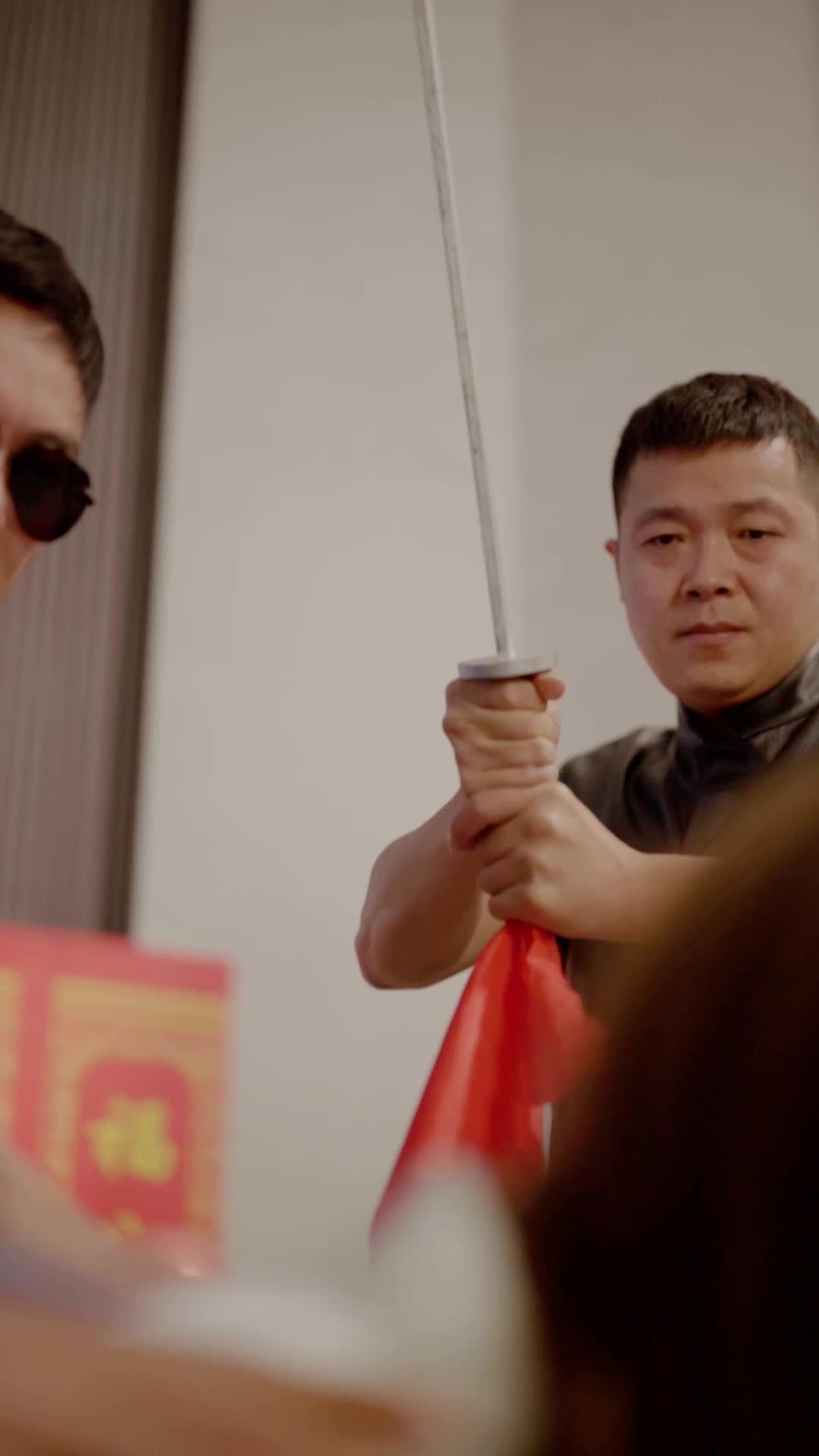 Let’s talk about the kind of scene that doesn’t just unfold—it detonates. In *The Double Life of My Ex*, the opening sequence isn’t a setup; it’s a declaration of war disguised as a celebration. A woman in white—Ling Xiao—kneels on the floor, arms outstretched like a martyr awaiting judgment, while two men in black suits press their hands onto her shoulders, not to comfort, but to restrain. Behind her, a man in sunglasses grips a ceremonial sword with both hands, blade pointed skyward, red silk dangling from the hilt like a warning flag. The camera lingers on his face—not angry, not triumphant, just… resolved. That’s the first clue: this isn’t about violence. It’s about ritual. And rituals, especially in this world, are never just for show.