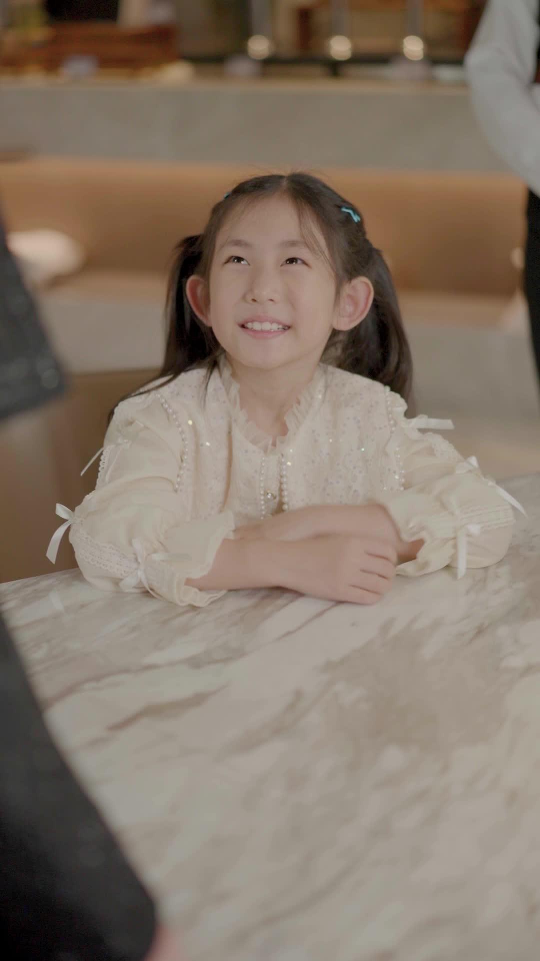In the hushed elegance of a high-end restaurant where marble tables gleam under golden pendant lights and floral arrangements whisper luxury, a quiet storm brews—not from clashing cutlery or spilled wine, but from the subtle tension between three women whose roles seem fixed yet are anything but. The scene opens with Xiao Yu, a wide-eyed girl no older than eight, seated at a table draped in cream silk, her pigtails tied with sky-blue clips, her dress embroidered with pearls like dewdrops on morning grass. She beams upward, hands clasped, then lifts them in joyful applause—perhaps for a magic trick, perhaps for the arrival of someone she adores. Her innocence is palpable, almost theatrical in its purity, as if she’s still playing dress-up in a world that hasn’t yet demanded she grow up. But the camera lingers just long enough to suggest this isn’t merely a child’s delight—it’s a performance, one she’s rehearsed before.