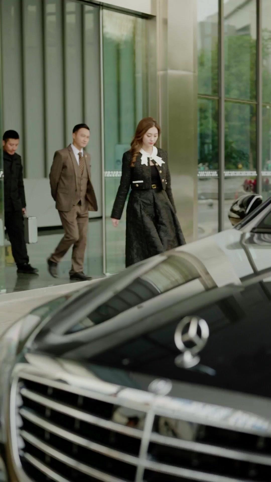 Let’s talk about the kind of scene that doesn’t need dialogue to scream volumes—just a woman in a tweed jacket, a Mercedes gleaming under overcast skies, and a man dragging a sack like he’s carrying his entire past behind him. The opening frames of *The Double Life of My Ex* are deceptively polished: Wandis Jensen steps out of a luxury sedan with the effortless poise of someone who’s never had to question whether her shoes match the pavement. Her outfit—a black-and-white ensemble with oversized bow collar and gold-button detailing—isn’t just fashion; it’s armor. She walks with purpose, flanked by two men in dark suits, one holding a briefcase like it contains state secrets. But the camera lingers on the car’s grille, the logo sharp and cold, as if reminding us: this world runs on symbols, not substance.