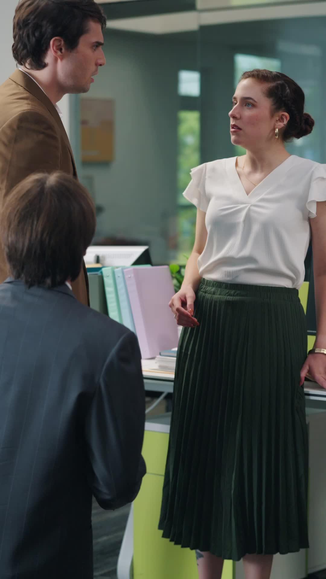 In the sleek, glass-walled corridors of modern corporate ambition, where power suits whisper secrets and floral arrangements mask emotional landmines, *The Double Life of the True Heiress* delivers a masterclass in psychological tension—not through explosions or chases, but through the quiet, devastating weight of a held hand. What begins as a seemingly routine office confrontation between Julian, the impeccably tailored brown-suited strategist, and Clara, the poised woman in white blouse and emerald pleats, quickly spirals into a narrative labyrinth where loyalty, desire, and deception are indistinguishable. The opening frames establish an immediate imbalance: Julian leans in, voice low but urgent, eyes locked on Clara’s face like he’s trying to decode a cipher only she holds. She doesn’t flinch—her posture is upright, her fingers resting lightly on the edge of a lime-green desk organizer, as if anchoring herself against the tide of his intensity. But then comes the third figure: Daniel, in charcoal pinstripes and a blue-striped tie, who enters not with authority, but with alarm. His gaze darts between them, mouth slightly open, as though he’s just walked into a scene he wasn’t meant to witness—and yet, somehow, he was always destined to be there.