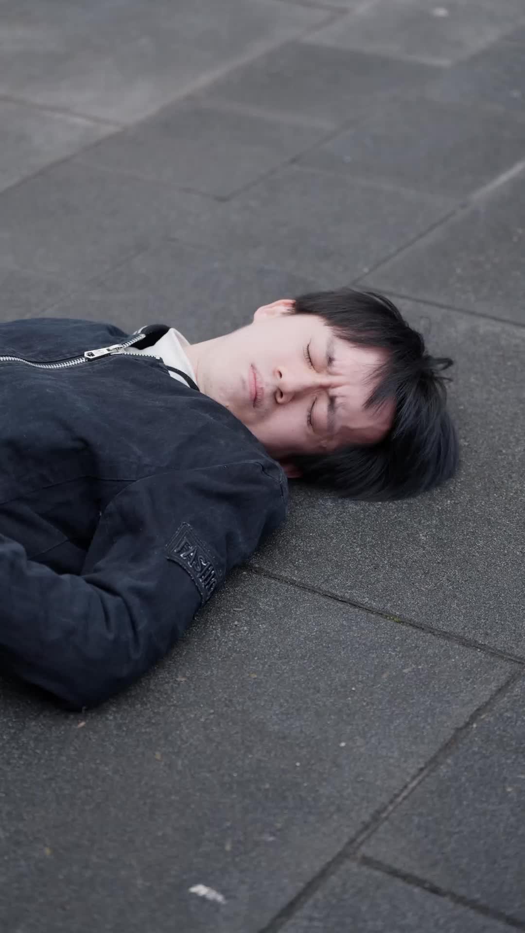 It begins with a man lying flat on the pavement—eyes shut, mouth slightly open, as if caught mid-sigh between consciousness and collapse. His black bomber jacket, zipped halfway, bears the faint imprint of ‘FASHION’ on the sleeve, a detail that feels almost ironic in this moment of vulnerability. The gray stone tiles beneath him are cold, unyielding, indifferent. This isn’t a staged fall; it’s too raw, too unpolished—the kind of stumble that makes bystanders hesitate before stepping forward. And yet, within seconds, the street transforms into a theater of moral ambiguity, where every gesture is scrutinized, every silence loaded.