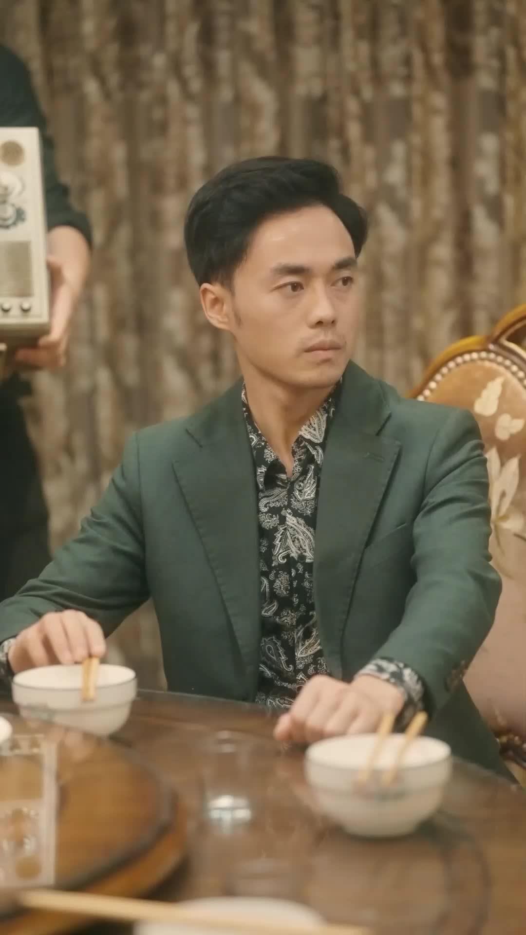 In the opulent, gilded dining hall of what feels like a 1990s Shanghai elite enclave—crystal chandeliers dripping light onto marble floors, heavy brocade curtains whispering secrets—the tension isn’t served with the Peking duck. It’s already on the table, simmering in the silence between chopsticks and porcelain bowls. The Gambler Redemption doesn’t open with a gun or a debt ledger; it opens with a man named Lin Zeyu, seated at the head of a round table, fingers resting lightly on two rice bowls as if they were chess pieces he hasn’t yet moved. His green blazer is impeccably tailored, but the paisley shirt beneath—black with silver filigree—suggests something older, more ornate, perhaps inherited from a father who knew how to lose gracefully. He doesn’t speak much in these early frames, yet his eyes dart—not nervously, but *calculatingly*. Every blink is a recalibration. Behind him, someone carries in a vintage KONKA television, its beige casing scuffed at the corners, screen blank but somehow accusing. That TV isn’t just set dressing; it’s a relic of a time when truth was broadcasted, not streamed, and when a single signal could rewrite a family’s fate. The moment it enters the room, the air thickens. Lin Zeyu’s knuckles whiten slightly on the rim of his bowl. He knows what’s coming.