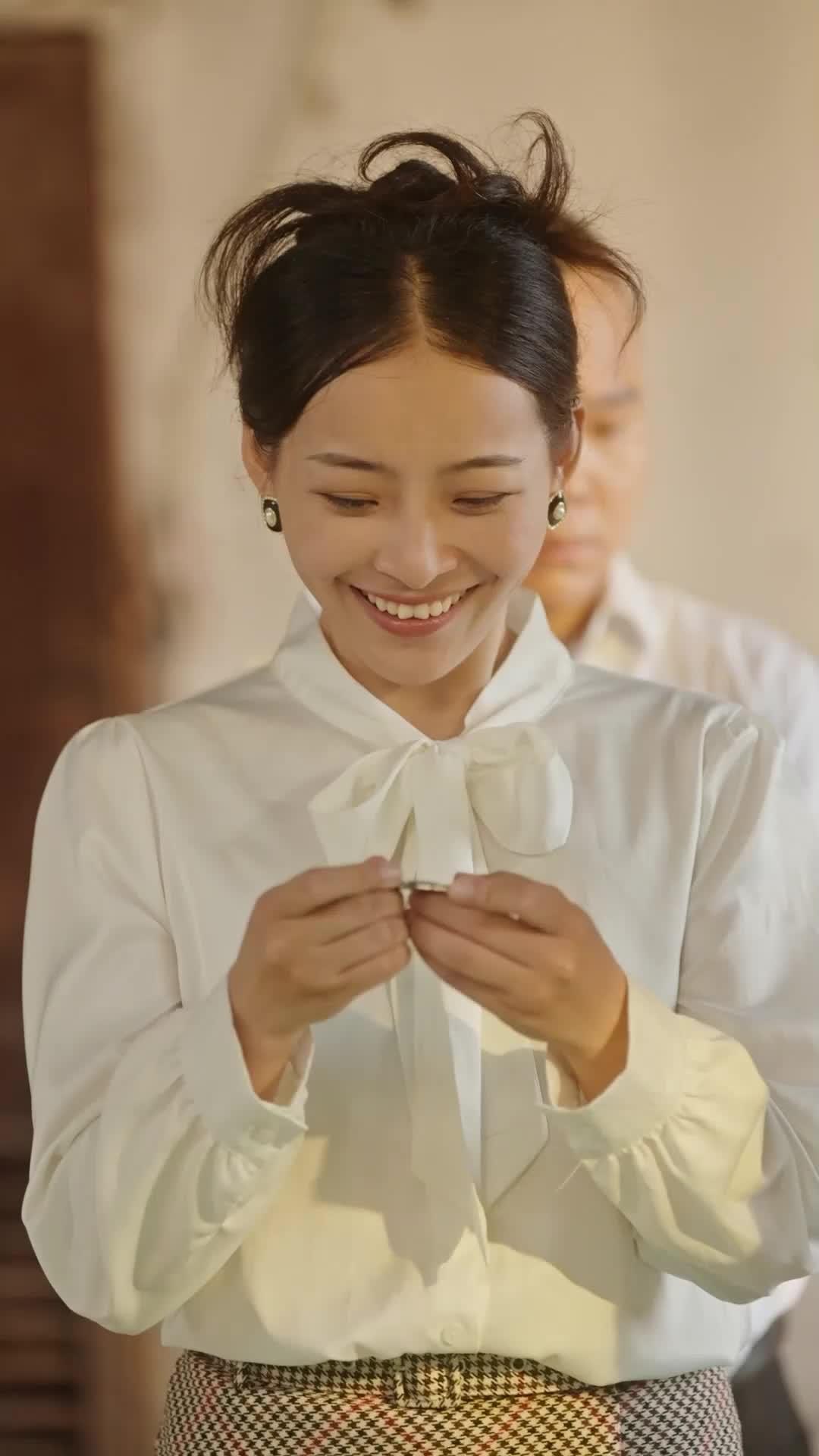 In the sun-bleached, crumbling interior of what appears to be an abandoned textile workshop—exposed brick, peeling plaster, and the faint hum of industrial machines left idle—the tension in *The Gambler Redemption* doesn’t come from gunshots or chases, but from a tiny metallic object held between two trembling fingers. That object, no larger than a thumbprint, becomes the fulcrum upon which the entire emotional architecture of the scene tilts. It’s not a weapon, nor a key, nor even a coin—but it might as well be all three. The woman, Lin Mei, dressed in a crisp white blouse with a bow at the throat and a houndstooth skirt that whispers of 1980s office chic, first cradles it like a prayer. Her smile is radiant, almost disbelieving, as if she’s just caught lightning in a bottle. But her eyes—those sharp, intelligent eyes—don’t quite match the joy on her lips. There’s calculation there, a flicker of hesitation beneath the delight. She lifts the token toward the light, turning it slowly, letting the dust motes dance around its edges. Behind her, Chen Wei stands with his hands in the pockets of his worn leather jacket, his posture relaxed but his gaze fixed—not on the token, but on Lin Mei’s face. He knows something she doesn’t. Or perhaps he knows exactly what she’s hiding.