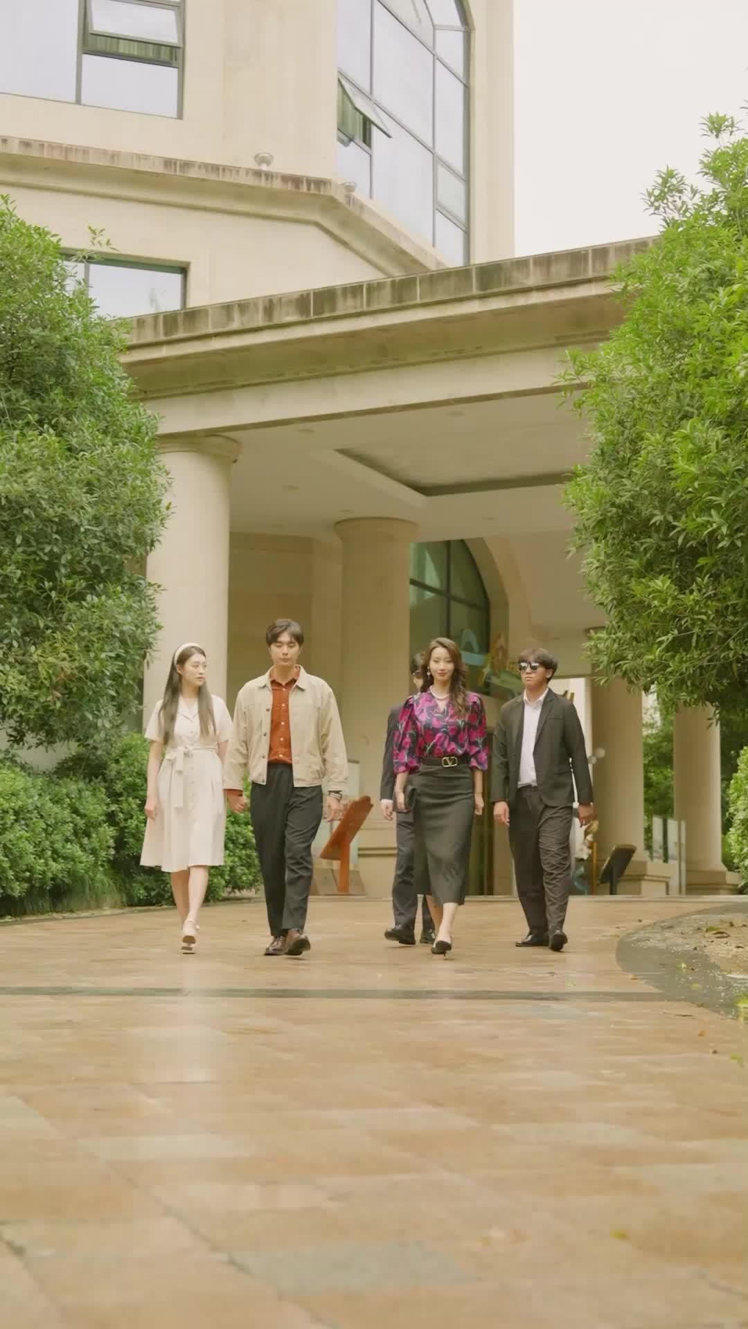 Imagine walking through a courtyard where every step feels staged—not because it’s fake, but because everyone involved knows they’re being watched. Not by cameras, necessarily, but by each other. In The Gambler Redemption, the opening sequence isn’t about destination; it’s about alignment. Five figures move in sync across tiled stone, flanked by manicured hedges and classical columns. The symmetry is intentional. This isn’t a chance encounter. It’s a convergence. And the moment it fractures—when Li Wei and Xiao Ran stop while Lin Mei, Chen Hao, and Zhang Yu keep walking—that’s when the real story begins. Not with a bang, but with a hesitation. A breath held too long. A hand that doesn’t quite let go.