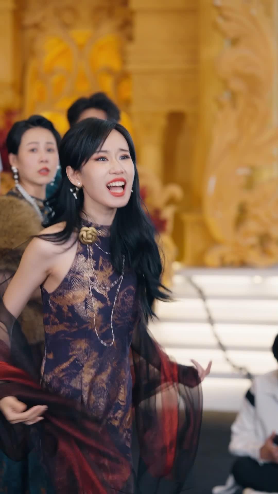 In a gilded hall where opulence whispers secrets and every chandelier casts shadows like silent witnesses, The Goddess of War does not stride—she *unfolds*. Her entrance is not announced by fanfare but by the subtle shift in air pressure, the way the red-and-black sheer shawl drapes over her shoulders like smoke caught mid-exhalation. She wears a halter-neck qipao embroidered with golden phoenixes and dragons—not as decoration, but as declaration. This is not costume; it is armor woven from silk and defiance. Her lips, painted crimson, part not in speech but in calculation. Every flick of her wrist, every tilt of her head, carries the weight of someone who has long since stopped asking for permission to exist. When she raises her hand at 0:20, it’s not a gesture of surrender—it’s a pause button pressed on chaos. And yet, behind that poised exterior, there’s a tremor. A micro-expression at 0:34—lips parted, eyes narrowing just enough to betray the crack in the porcelain. She’s not afraid. She’s *assessing*. Who among them is worth her attention? Who is merely background noise?