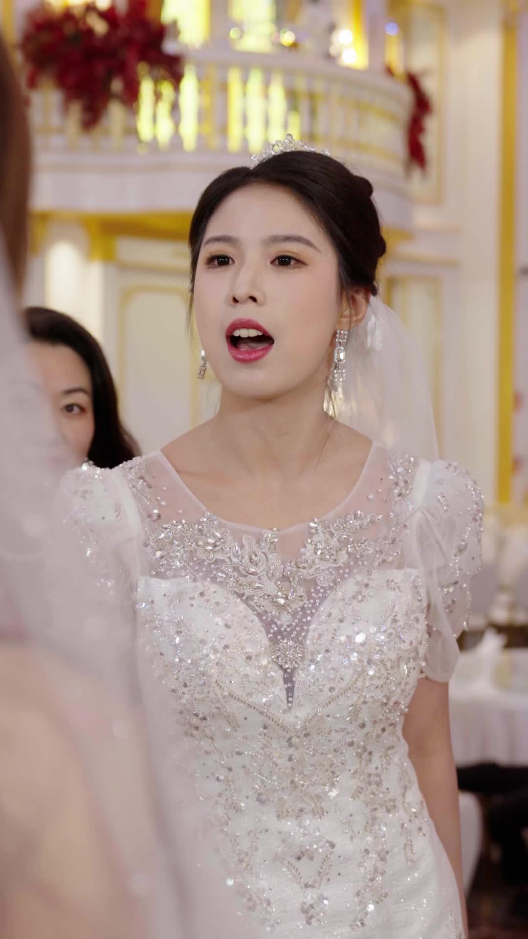 Let’s talk about silence. Not the peaceful kind—the kind that settles after a storm—but the loaded, trembling silence that fills a room when someone has just dropped a grenade wrapped in lace and pearls. That is the exact atmosphere captured in the pivotal wedding sequence of *The Hidden Dragon: A Father's Redemption*, where every unspoken word carries more weight than a shouted confession. The setting is lavish: a ballroom with vaulted ceilings, golden balustrades, and floral arrangements so dense they seem to breathe. Guests wear designer attire, their postures polished, their smiles rehearsed. This is not just a wedding—it’s a performance, a ritual of social validation. And then Zhou Meiling walks in—or rather, is *dragged* in—her white gown glittering under the chandeliers, her veil askew, her face a map of betrayal and desperation. She doesn’t need a microphone. Her voice, though unheard by us, vibrates through the frame. Her mouth moves with the force of someone who has held her truth for too long, and now, with the world watching, she refuses to swallow it again.