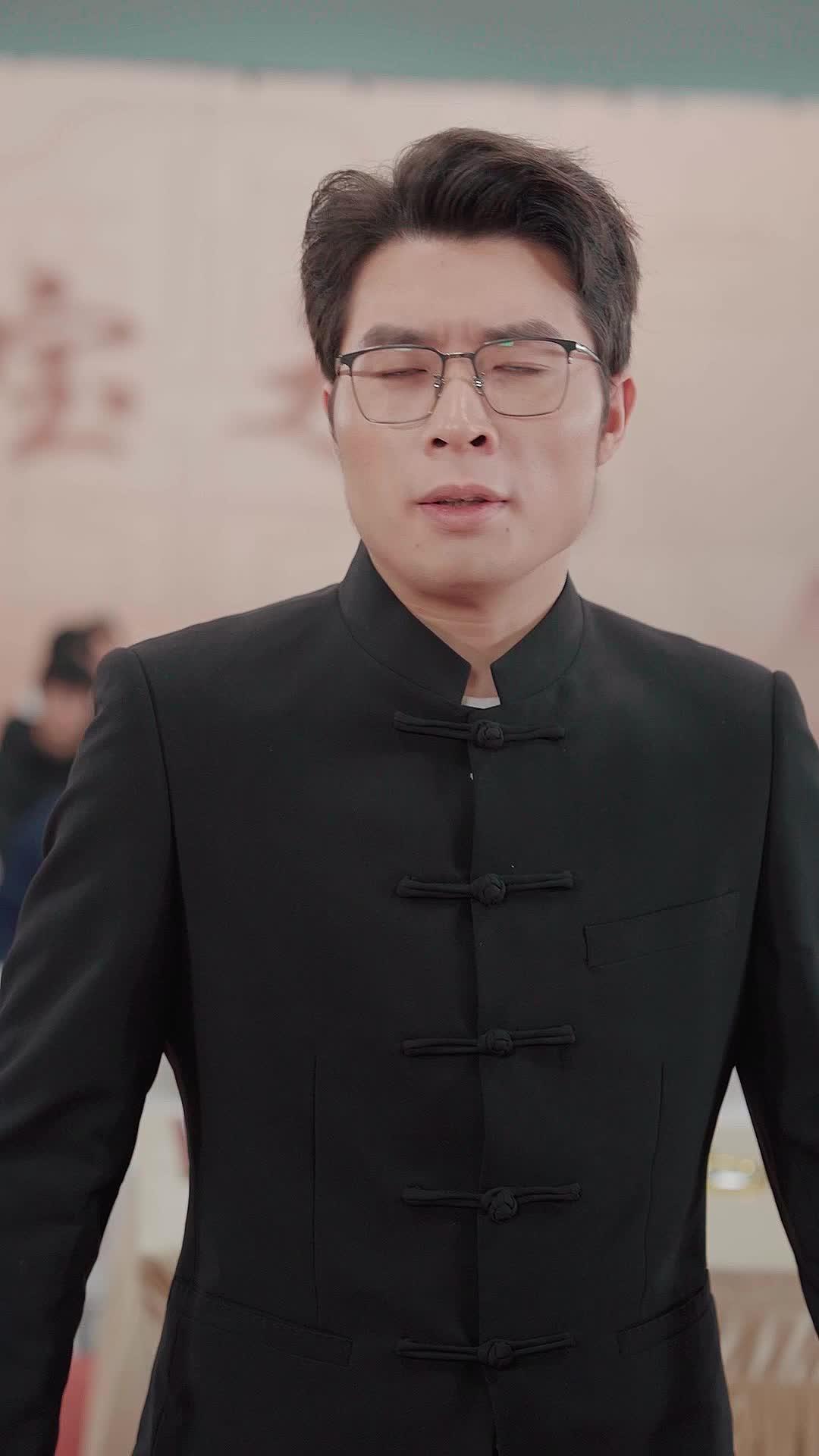 Let’s talk about what happened on set—not the script, not the lighting, but the raw, uncut tension that leaked through every frame like steam from a cracked teapot. The moment opens with Lin Wei, dressed in that stark black Tang suit, standing rigid as if he’s already been sentenced. His glasses are clean, his posture precise, but his eyes—oh, his eyes flicker like a candle caught in a draft. He’s not just waiting for his cue; he’s bracing for impact. Behind him, the backdrop reads ‘The Imperial Seal’ in elegant calligraphy, but the real story isn’t on the wall—it’s in the way his fingers twitch at his sides, as though rehearsing a confession he hasn’t yet spoken.