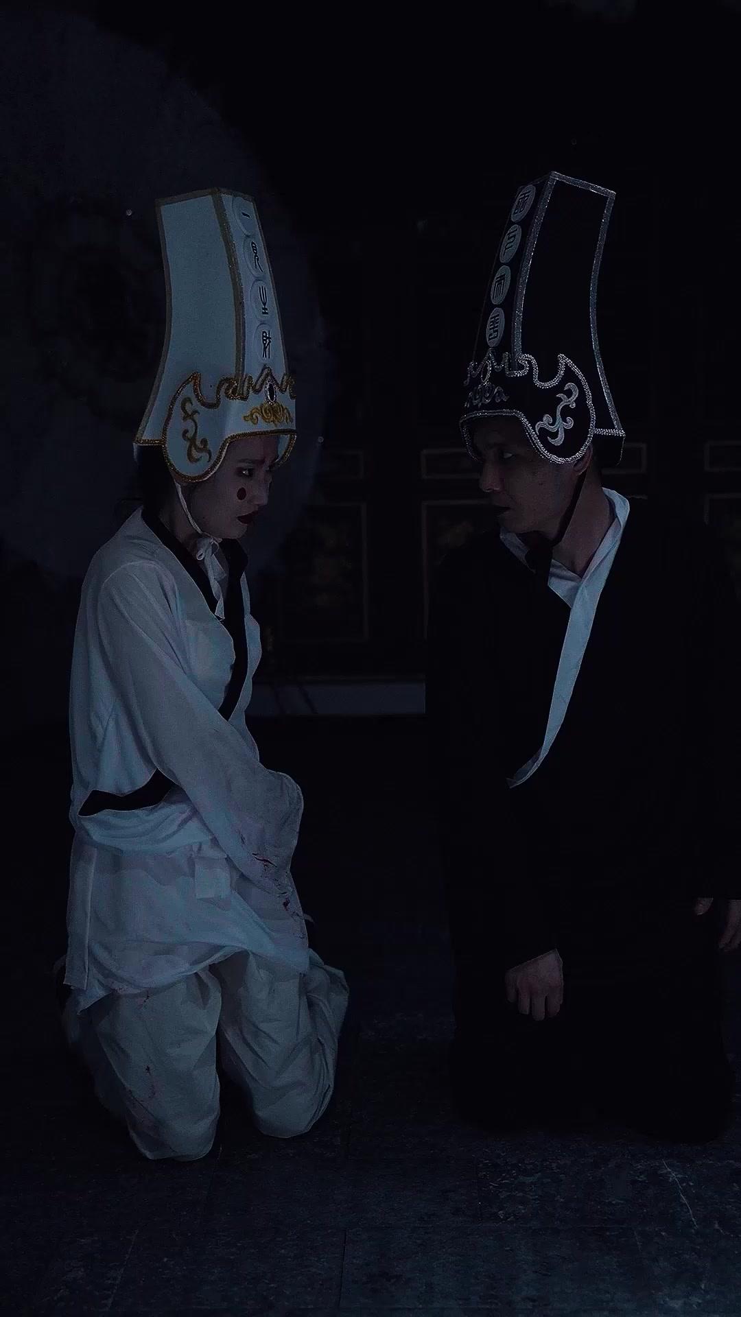 First, the setting: a temple interior, but not one meant for worship. The walls are scarred, the floor uneven, and behind the kneeling pair, a massive circular emblem looms—cracked, faded, yet unmistakably a *fu* talisman, inverted. In folk belief, an upside-down fu means ‘the seal is broken.’ So yes, the sacred space is compromised. And the two kneeling figures? Their makeup is theatrical—white faces, red dots on cheeks—but their trembling isn’t staged. Watch their hands: the white-robed one grips his own sleeve like he’s trying to stop himself from vomiting; the black-robed one’s fingers dig into his thigh, nails leaving crescent marks. They’re not actors. They’re witnesses. And witnesses, in *The Invincible*, are the most dangerous people of all.