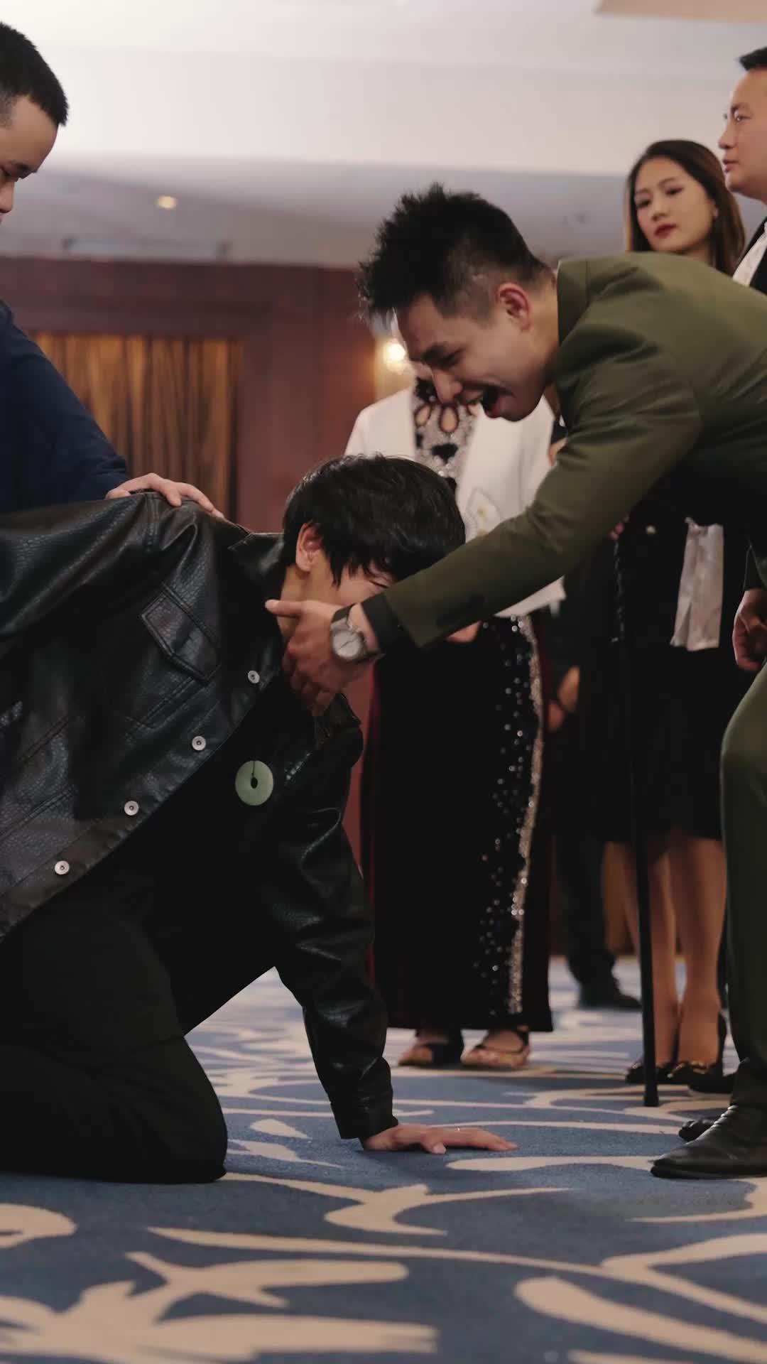In *Rich Father, Poor Father*, that jade pendant isn’t just jewelry—it’s a weapon of humiliation. The way it clatters when he’s shoved down? Chilling. The green-suited man’s smirk versus the leather-jacketed boy’s trembling lips—pure emotional warfare. Every close-up feels like a knife twist. 🩸 #PowerPlay
