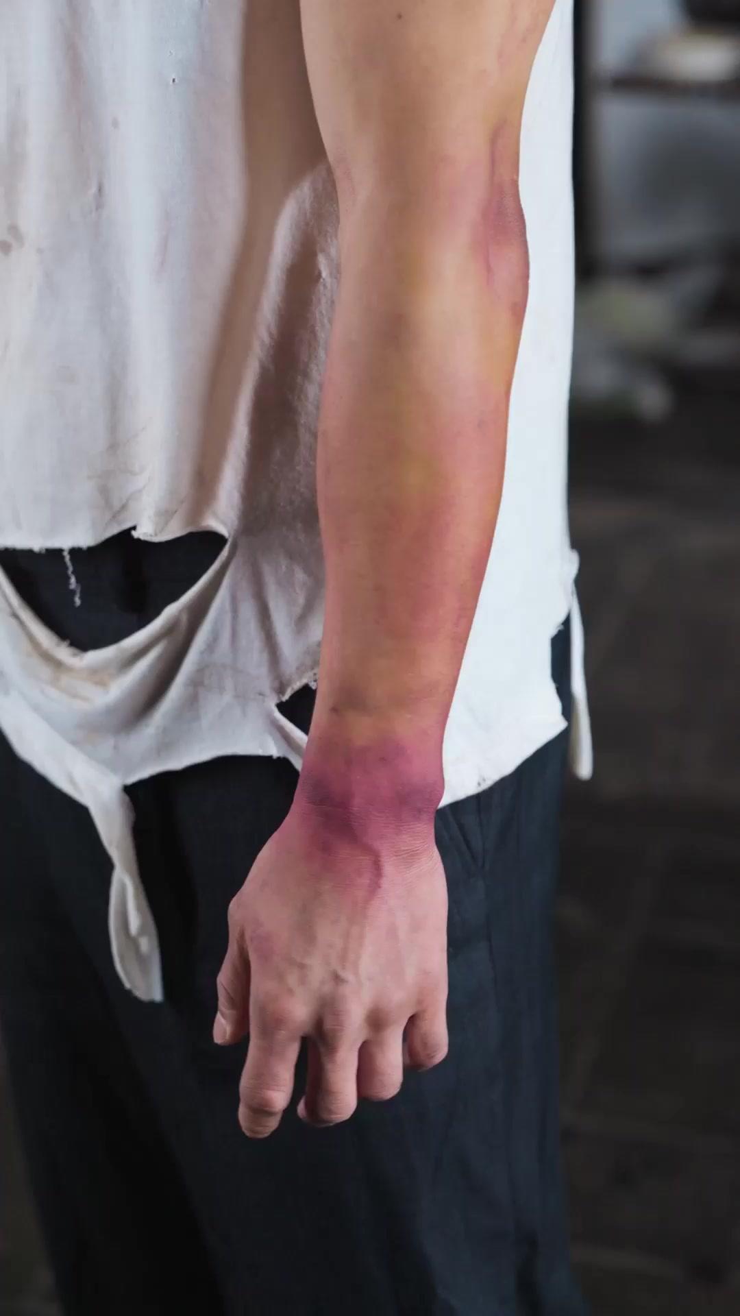 The opening shot of the video is not subtle—it’s visceral. A forearm, swollen and purpled with bruising, hangs limply at the side of a man in a torn white shirt. The fabric is stained, frayed at the hem, and tied haphazardly around his waist like a makeshift apron. His hand trembles slightly, fingers curled inward—not from pain alone, but from exhaustion, shame, or something deeper. This isn’t just injury; it’s evidence. And the camera lingers on it long enough for us to wonder: who did this? And why does he still walk upright, still carry himself with quiet dignity despite the visible wreckage?