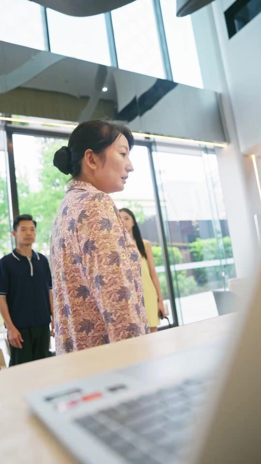 There’s a specific kind of panic that only manifests in corporate lobbies—sterile, bright, and utterly unforgiving. No curtains to hide behind, no dim corners to dissolve into. Just reflective floors that mirror your despair, and glass walls that broadcast your breakdown to the world. In The Nanny's Web, this setting isn’t backdrop; it’s antagonist. The opening frames establish the rhythm: a woman in a leaf-patterned blouse—let’s name her Auntie Zhang—approaches the counter with the quiet dignity of someone who has navigated bureaucracy for decades. Her shoes are practical, her posture upright, her expectations modest. She’s not here to negotiate. She’s here to confirm. To receive the keys. To begin the next chapter. Behind her, Li Wei watches, restless, tapping his boot against the tile. He’s younger, impulsive, the kind of man who believes in momentum over caution. And then there’s Mr. Chen, the sales director, whose smile is calibrated to the millisecond, whose handshake feels like a legal document being signed in real time.