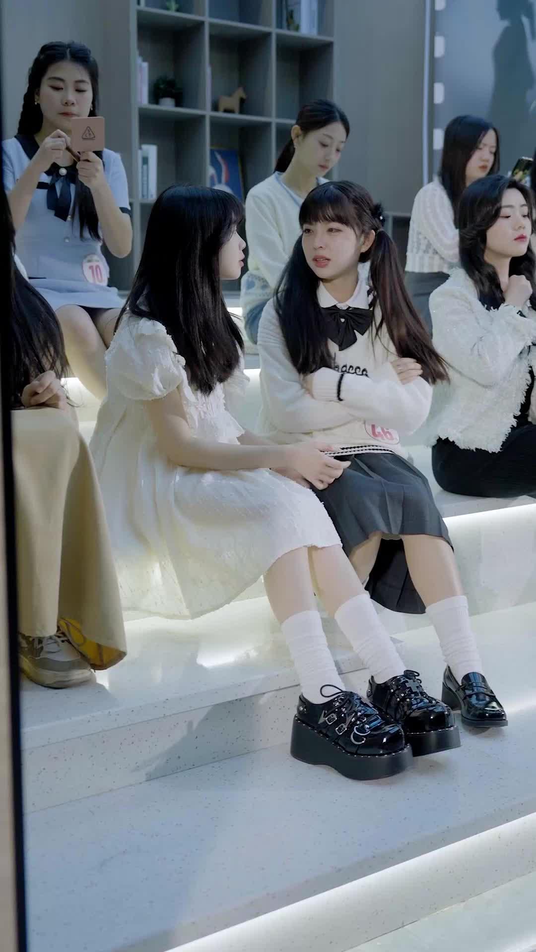 In the hushed, modern amphitheater of *The Radiant Road to Stardom*, where light spills like liquid silver across tiered white benches, a quiet storm brews—not with screams or glitter, but with the subtle tremor of knuckles pressed together, the flicker of an eyelid held too long, the way a breath catches just before it’s released. This isn’t a casting call; it’s a psychological excavation. Every woman seated there wears not just clothes, but armor—some polished and sharp like Lin Xiao’s black double-breasted blazer with gold buttons, others soft and frayed like Chen Yiran’s cream cardigan, its blue heart-patterned hem whispering vulnerability beneath its calm surface. And yet, none of them are merely waiting. They are *listening*—to the rustle of papers, to the click of heels on marble, to the unspoken verdict hanging in the air like dust motes caught in a sunbeam.