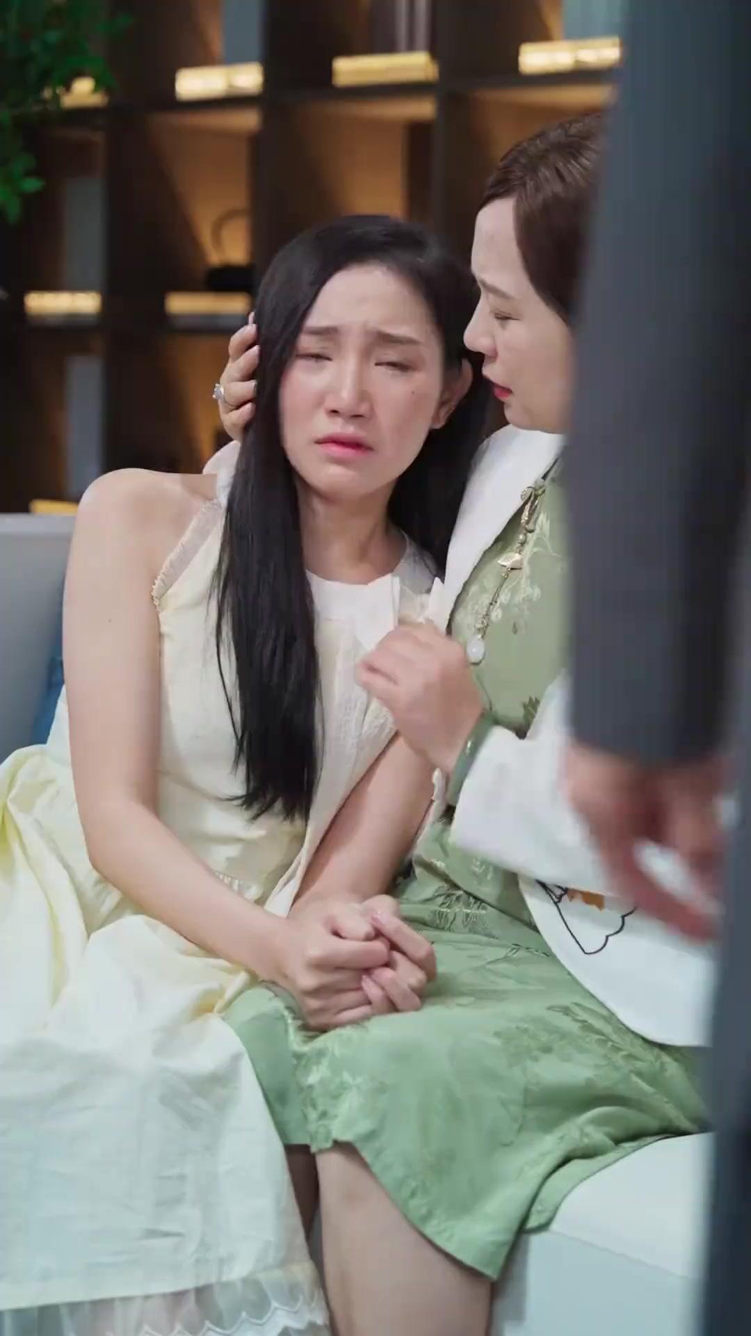 Beside her, Madame Chen, clad in a jade-green qipao under a white silk jacket, embodies the archetype of the composed matriarch—but her composure is fraying. She strokes Lin Xiao’s hair with one hand while gripping her shoulder with the other, her expression oscillating between maternal concern and quiet desperation. Notice how her left hand, adorned with a jade bangle and a diamond ring, never leaves Lin Xiao’s body—this is not comfort; it’s containment. She is holding the girl together, yes, but also preventing her from rising, from confronting, from *acting*. Her gaze flicks repeatedly toward the man standing before them—the bald-headed patriarch, Mr. Wu—whose stillness is more unnerving than any outburst could be. He stands with hands clasped behind his back, a posture of institutional control, his suit immaculate, his tie perfectly knotted, his lapel pin—a tiny silver heart—ironically gleaming. When he finally lifts his eyes, it’s not to Lin Xiao, but upward, as if consulting some higher moral ledger. His silence is not neutrality; it is judgment deferred, power asserted through absence of reaction.