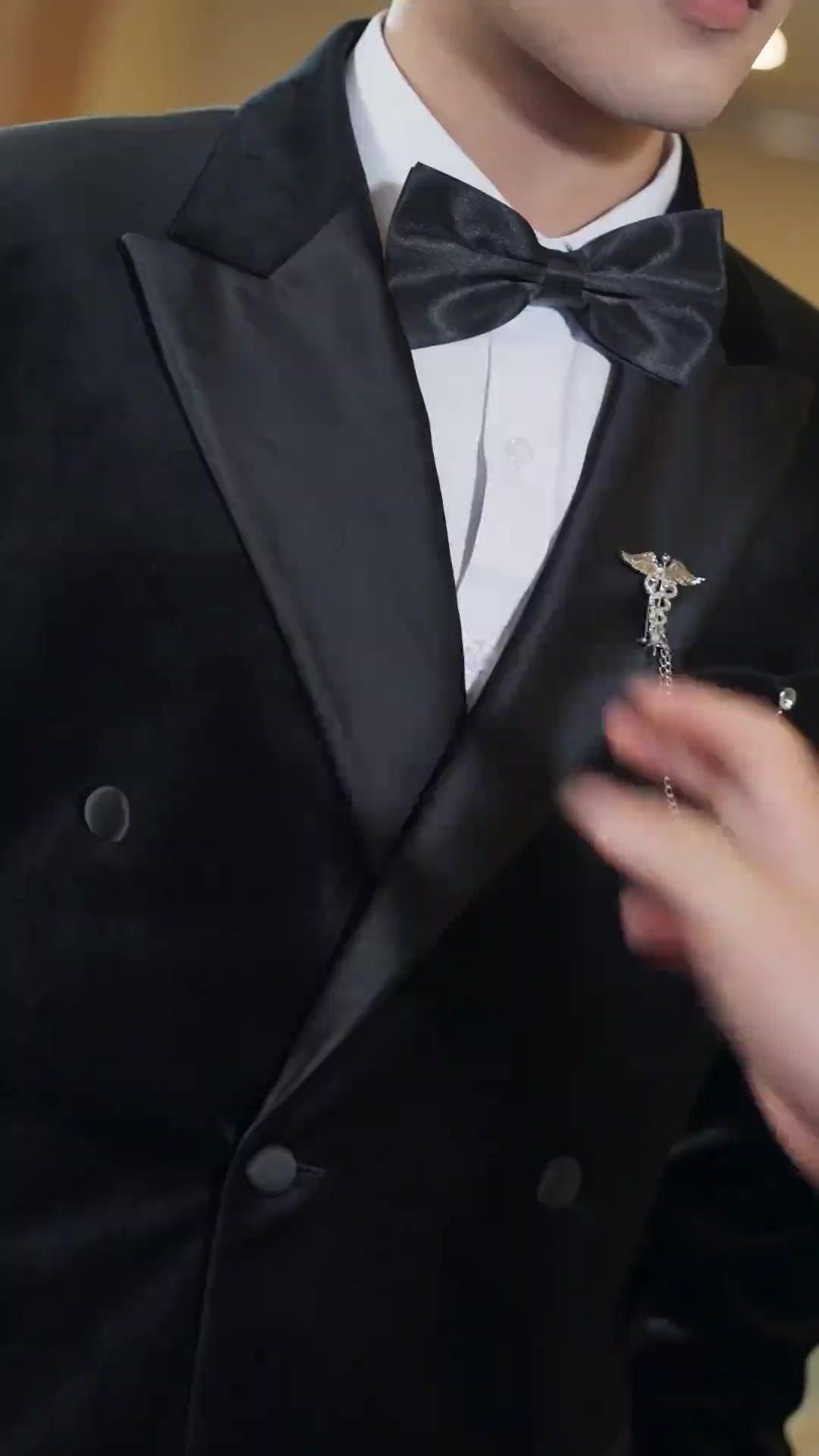 Let’s begin with Li Zeyu—the man in black. Not just any black, but *velvet* black, double-breasted, with satin lapels that catch the light like oil on water. His bowtie is perfectly symmetrical, his white shirt crisp enough to slice paper. But it’s the brooch—a silver caduceus with dangling chains—that gives him away. It’s not medical. It’s ceremonial. Symbolic. A relic from a past he refuses to bury. When another man, Chen Wei, reaches out to adjust his collar, it’s not assistance—it’s an inspection. A test. Li Zeyu’s eyes flick downward, then up, not with gratitude, but calculation. He lets the touch linger just long enough to register discomfort, then pulls away with a fractional tilt of his chin. That’s how power works here: not through shouting, but through *withholding*. Chen Wei, in his gray plaid three-piece suit, blue shirt, and tie pinned with a tiny gold rose, watches him like a hawk studying prey. His expression shifts between concern, disbelief, and something darker—resentment, perhaps, or envy. He speaks quickly, mouth open mid-sentence in several frames, fingers jabbing the air like he’s trying to puncture Li Zeyu’s composure. But Li Zeyu doesn’t flinch. He listens. He absorbs. And when he finally responds, it’s with a slow blink and a half-smile that doesn’t reach his eyes. That smile says: *I know what you’re thinking. And I’ve already accounted for it.*