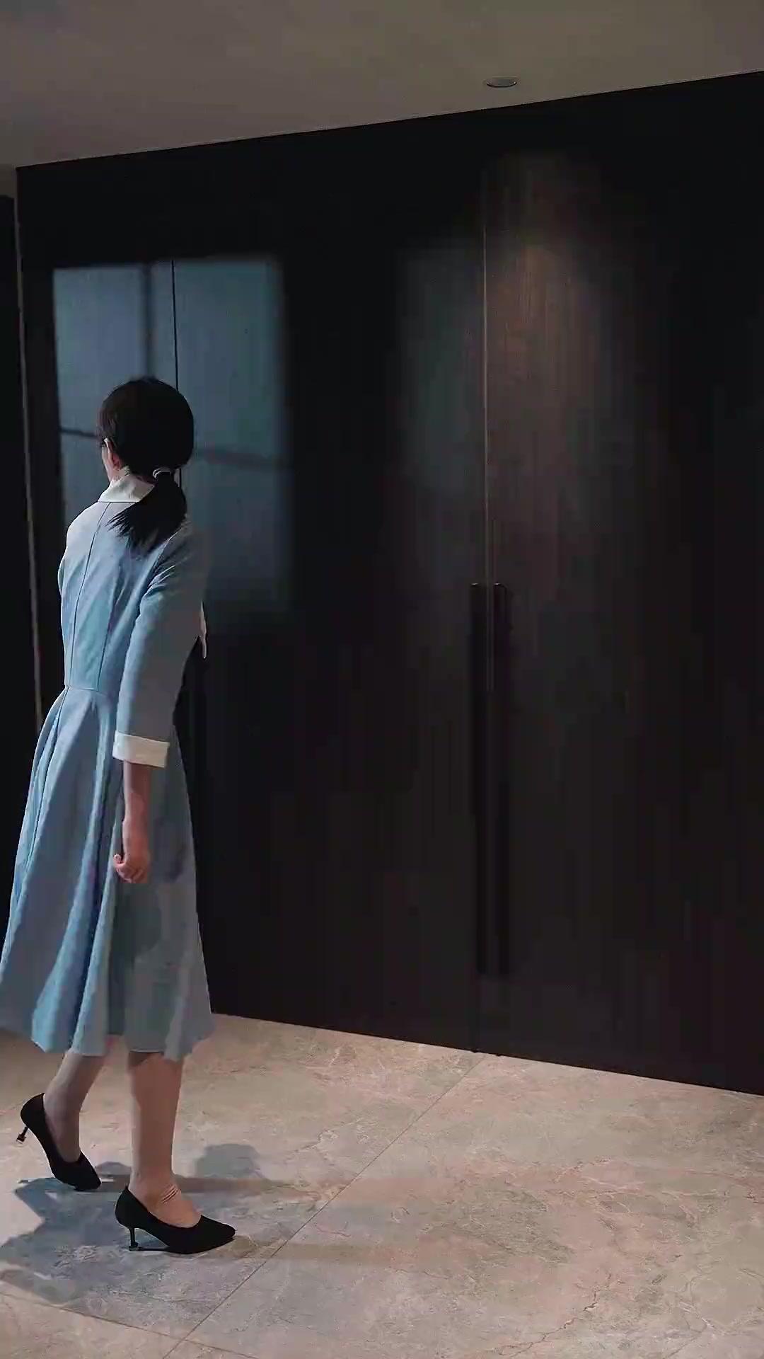In the opening frames of *The Reunion Trail*, we’re introduced not with fanfare, but with quiet precision—a woman in a pale blue dress, her hair pulled back in a neat ponytail, walking with purpose across a polished stone floor. Her heels click like a metronome counting down to inevitability. She moves toward a wall of dark wood cabinetry, sleek and minimalist, lit by recessed LED strips that cast soft halos around each shelf. This isn’t just décor; it’s a stage set for revelation. Every object on those shelves—the abstract ceramic vases, the woven basket, the small golden sculpture of a bird mid-flight—feels curated, intentional, almost symbolic. The woman, whom we’ll come to know as Lin Xiao, doesn’t glance at them idly. She scans, she pauses, her fingers brushing the edge of a shelf as if testing its solidity. There’s tension in her posture, a slight forward lean, as though she’s already bracing for impact. When she reaches up and pulls out a blue folder, the camera lingers on her hands—steady, practiced, yet betraying a subtle tremor as she flips open the first page. The document inside is crisp, formal, stamped with an official seal. She reads it quickly, then again, slower this time, her brow furrowing. It’s not just information she’s absorbing—it’s confirmation. Confirmation of something she feared, or perhaps something she hoped was false. The way she tucks the paper back into the folder, then lifts the entire thing high above her head as if weighing its moral gravity, tells us everything: this isn’t paperwork. It’s evidence.