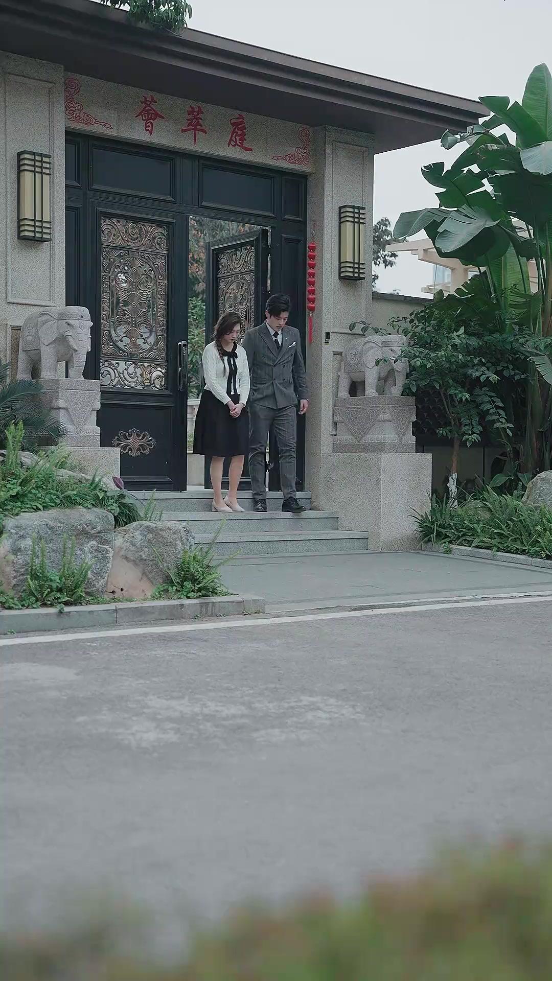 There’s something hauntingly cinematic about the way Li Wei and Chen Xiao stand just beyond the threshold of that ornate black gate—two figures caught in the liminal space between departure and decision. The gate itself, carved with intricate phoenix motifs and flanked by stone elephants, isn’t merely architecture; it’s a symbol of legacy, authority, and unspoken expectations. Red lanterns hang like punctuation marks on the edge of tradition, while the overcast sky casts a muted pallor over everything—no sun, no shadows, only the soft weight of unresolved emotion. This is not a scene of celebration. It’s a quiet unraveling.