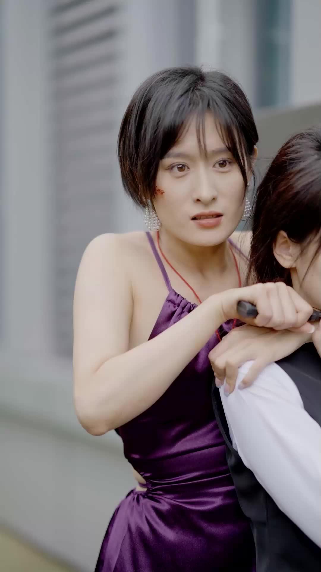 Xiao Yu, dressed in that crisp white shirt and tailored black vest—a uniform of order, of quiet competence—is reduced to a trembling vessel of fear. Her hands clutch at Li Na’s forearm, not in resistance, but in desperate plea. Her mouth opens slightly, as if trying to form words, but no sound comes out. That silence is deafening. It’s not just fear; it’s betrayal crystallized. You can see the memory flicker behind her eyes—the shared laughter over tea, the late-night study sessions, the way Li Na once fixed her broken heel with a bobby pin and a grin. Now, that same hand holds a blade to her jugular. The contrast is brutal. The purple satin dress Li Na wears isn’t just elegant; it’s *ironic*. Satin suggests luxury, celebration, something worn for a gala. Here, it’s stained with sweat and the faintest trace of rust-colored blood, a visual metaphor for how beauty and brutality are often stitched together in the same fabric.