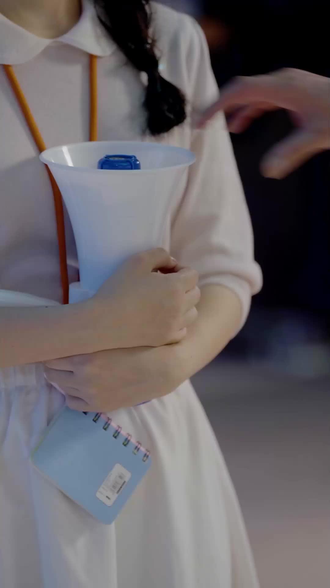 In the sleek, reflective corridors of what appears to be a high-end tech expo or futuristic retail hub—its polished floor mirroring neon signage and ambient blue lighting—the tension in *The Silent Heiress* isn’t born from explosions or chases, but from the quiet tremor of a pen scratching paper, the hesitant grip on a megaphone, and the way a single glance can unravel years of silence. At the center stands Lin Xiao, the titular heiress, though her title feels less like privilege and more like a burden she’s been forced to wear like a white dress with a collar too stiff for comfort. Her hair is braided neatly, an attempt at order; her orange lanyard hangs like a question mark around her neck, its color too vivid against the muted tones of her attire—a visual metaphor for how she’s been thrust into visibility without consent. She clutches a small spiral notebook, its cover pale blue, almost apologetic, as if it knows it will soon bear witness to something no one wants recorded.