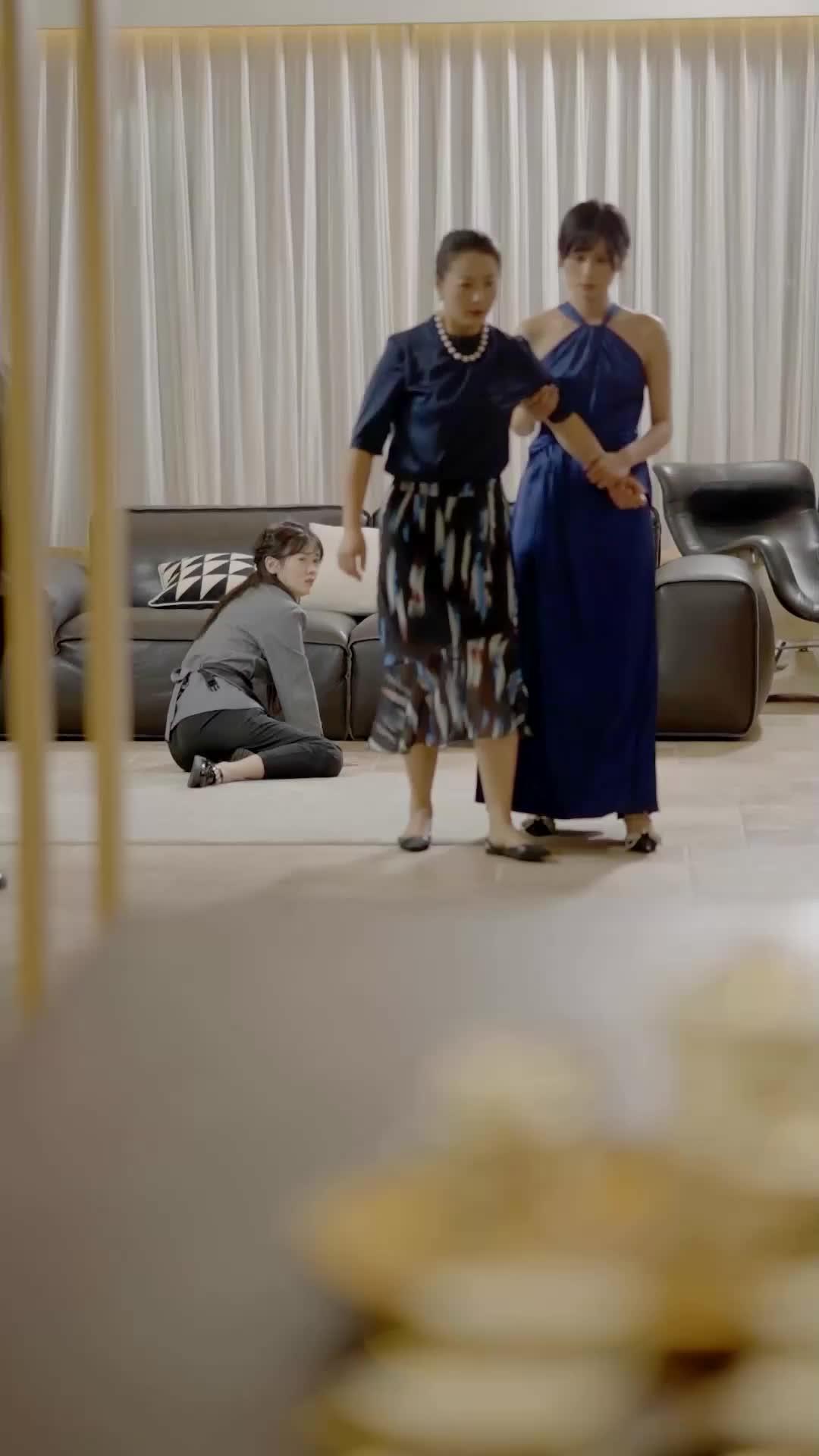 Standing over her are two women whose attire screams inherited privilege. The older woman—Madam Chen, we later learn from context—is draped in navy silk, her hair pulled back in a severe bun, pearls resting like judgmental sentinels around her neck. Her expression shifts subtly across the sequence: from cold detachment to flickers of discomfort, then to outright alarm when the young man enters. Her body language is rigid, arms crossed, shoulders squared—a fortress built against vulnerability. Beside her stands Xiao Yu, the younger woman in the cobalt halter gown, her posture elegant but brittle. Her fingers twist a red string—perhaps a talisman, perhaps a remnant of childhood, perhaps a symbol of binding fate. The red thread reappears later, held tightly in her palm as she points accusingly—not at Lin Mei, but at the space between them, where truth has been buried.