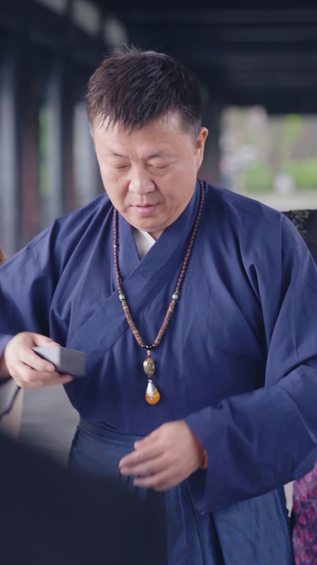 In a dimly lit corridor of what appears to be an ancient temple or ancestral hall—its wooden beams weathered, its pillars carved with faded calligraphy—the tension is thick enough to slice with a blade. The air hums not with sound, but with anticipation, as if the very stones are holding their breath. At the center of this silent storm stands Li Wei, clad in deep indigo robes that ripple like still water when he moves. His attire is traditional yet refined: a layered hanfu with pleated skirt, a white inner collar peeking modestly beneath, and a long beaded necklace ending in a teardrop-shaped amber pendant—perhaps a relic, perhaps a talisman. Around his wrist, a string of polished wooden prayer beads rests loosely, as though he’s just finished reciting sutras—or preparing to break them. He holds a small black lacquered box, no larger than his palm, turning it slowly between his fingers. His expression shifts from contemplative to startled, then to something sharper—alarm? Recognition? His lips part, not quite speaking, but forming words only he can hear. The camera lingers on his hands: steady, practiced, yet trembling just slightly at the third knuckle. This isn’t mere curiosity—it’s reverence laced with dread.