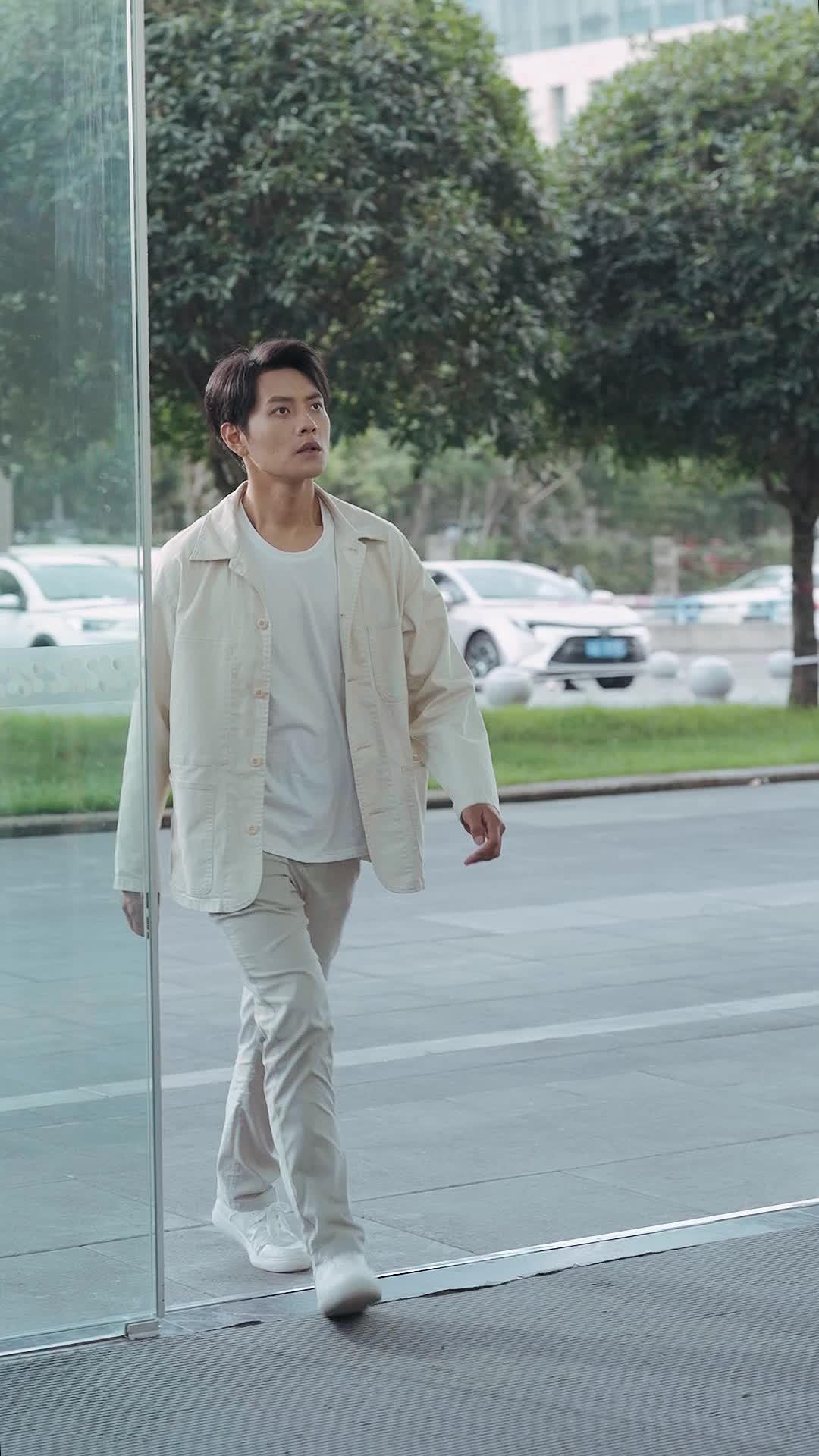 The opening shot of *The Three of Us* is deceptively simple: a man in cream-colored linen walking through a glass corridor, sunlight catching the edges of his jacket, cars blurred in the background like distant memories. But this isn’t just a walk—it’s a performance. Li Wei moves with the relaxed assurance of someone who believes he belongs, yet his eyes scan the reflections in the glass walls, searching for confirmation. He doesn’t see himself clearly. He sees fragments: his own profile, the trees outside, the passing silhouette of a woman in a white blouse. The glass doesn’t reflect truth; it distorts it. And that’s the central metaphor of the entire series: in modern professional life, identity is never fixed—it’s refracted, multiplied, obscured by context. Inside the lobby, the marble floor becomes the next layer of illusion. Its high gloss mirrors not just bodies, but intentions. When Zhang Lin approaches Li Wei, her reflection walks beside her, slightly ahead, as if her future self is already moving toward him. She holds a blue folder—standard office issue—but the way she grips it suggests it contains more than paperwork. Her nails are painted a muted coral, her earrings small but sparkling, her lanyard bearing the name ‘Zhang Lin’ in clean sans-serif font. She speaks softly, her tone practiced, but her pulse is visible at her throat. Li Wei listens, nodding, but his fingers twitch at his sides. He’s not absorbing information; he’s decoding subtext. Every pause, every breath, every shift in her posture is data. When she lifts her phone to take a call, the camera zooms in on her thumb hovering over the screen—not dialing, not ending, just *holding*. That hesitation is the crack in the facade. In *The Three of Us*, communication isn’t broken by noise—it’s broken by silence held too long.