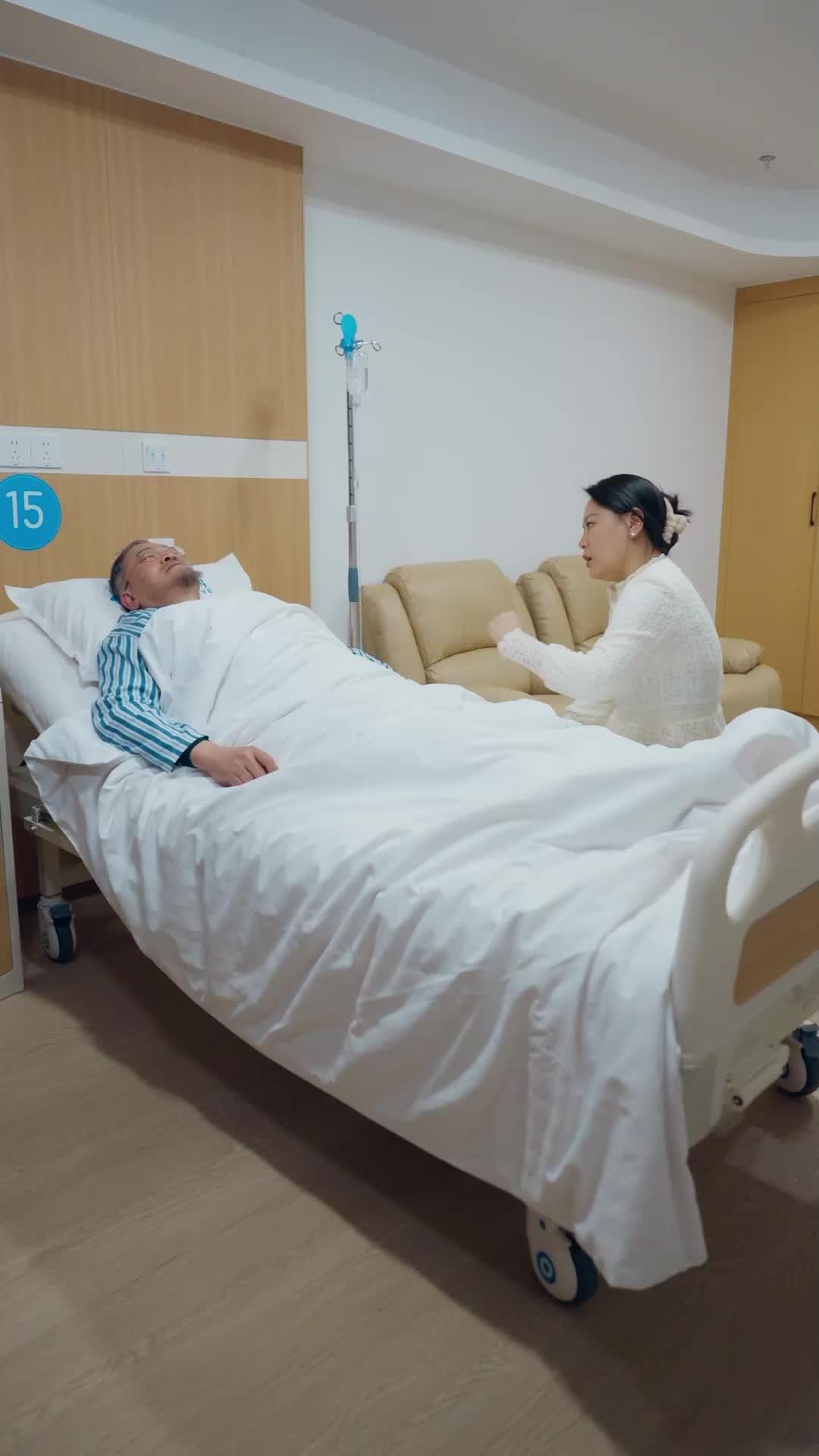 In the quiet, softly lit corridor of Room 15, where the scent of antiseptic mingles with the faint aroma of potted plants, a scene unfolds that feels less like medical routine and more like a slow-burning drama—*The Unlikely Chef*, though not yet in the kitchen, already carries its signature tension. The man in the striped hospital gown—let’s call him Mr. Lin—isn’t merely resting; he’s suspended between consciousness and surrender, his eyes half-lidded, his breath shallow but steady. His wife, Ms. Wei, sits beside him, her white lace blouse immaculate, her posture rigid with suppressed urgency. She doesn’t just speak to him—she pleads, she negotiates, she *performs* concern with such precision that one wonders whether she’s trying to convince him… or herself. Her hands flutter near the blanket, adjusting it not for comfort, but as punctuation marks in an unspoken monologue. When she finally rises, her movement is sharp, decisive—a pivot from caregiver to conspirator—and she exits without looking back, leaving Mr. Lin alone with his silence and the blue number ‘15’ glowing on the wall like a countdown. That moment lingers: what did she leave behind? A pill? A note? A lie wrapped in silk?
