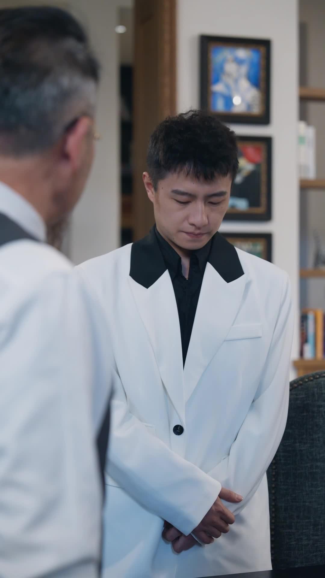 Let’s talk about the kind of scene that doesn’t scream drama but whispers it—softly, insistently, like steam rising from a bowl of soup left too long on the table. In *The Unlikely Chef*, we’re not handed a grand kitchen showdown or a Michelin-starred duel. Instead, we get something far more unsettling: silence, posture, and a single ceramic bowl with a spoon resting inside. The first man—let’s call him Li Wei—stands rigid in a white double-breasted suit, black lapels sharp as a blade, his hands clasped low, eyes downcast. He’s not nervous. Not exactly. He’s *waiting*. Waiting for permission. Waiting for judgment. His expression is neutral, but his jaw is tight, his breath shallow. You can see it in the way his fingers twitch just once when the older man—Master Chen, with his silver-streaked temples and wire-rimmed glasses—leans forward to adjust the bowl on the dark wooden table. That tiny movement? It’s not fear. It’s calculation. He knows what’s coming. And he’s already rehearsed his response.