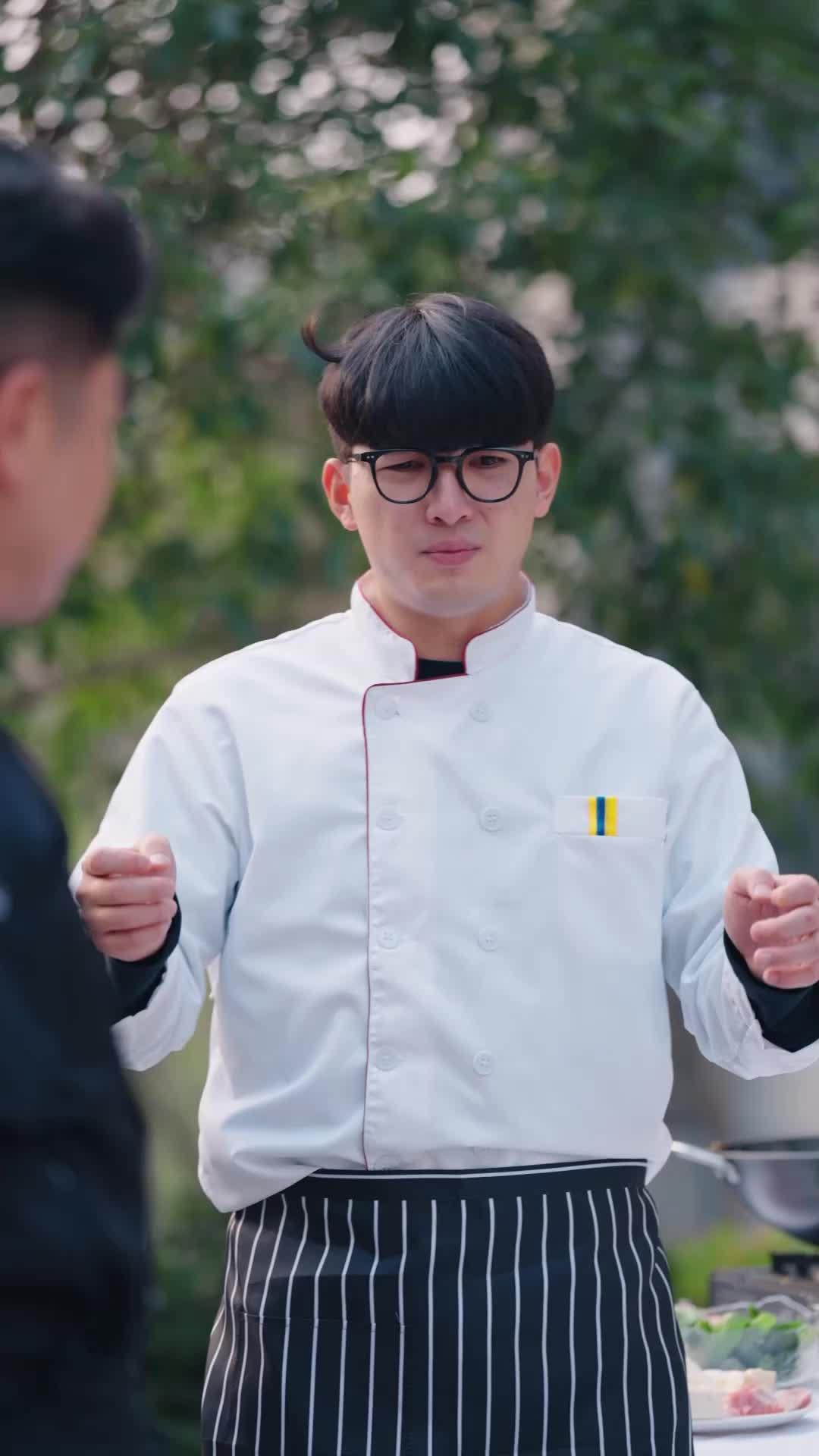 Let’s unpack the staging. The opening scene is deceptively bright: natural light, greenery, a table laden with raw produce. But the composition tells another story. Lin Jie stands center-frame, but he’s visually boxed in—by Zhang Wei’s looming presence on one side, by the out-of-focus crowd behind him, by the very structure of his own uniform, crisp and constricting. His gestures are expansive, yet his feet stay rooted. He’s performing leadership, but his body screams uncertainty. Meanwhile, Zhang Wei—older, broader, wearing black like a shield—doesn’t need to speak. His eyebrows do the work. A slight lift, a slow blink, and you know he’s already judged the dish before it’s plated. Their dynamic isn’t mentor-student; it’s survivor and hopeful. Zhang Wei has been burned before. Lin Jie hasn’t yet realized the flame is coming.