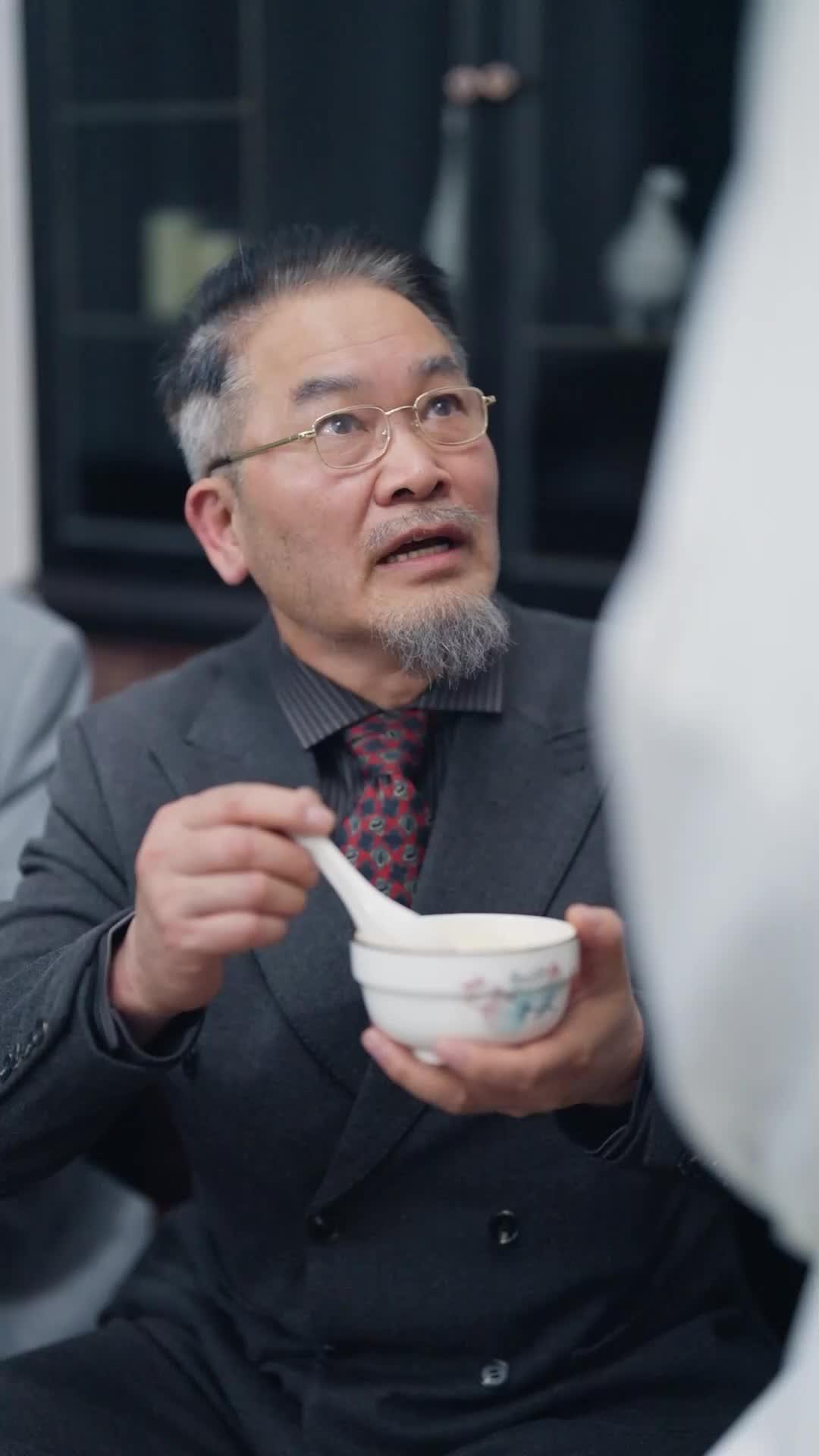 The film opens not with a sizzle pan or a knife chopping garlic, but with Master Lin seated at a low table, bowl in hand, spoon hovering. His expression is one of mild confusion—like he’s just realized the soup is missing its final ingredient, and that ingredient is *him*. He looks up, not at the camera, but at Xiao Wei, who stands just outside the frame, half-hidden behind a curtain of white fabric. The contrast is immediate: Lin, steeped in tradition, draped in wool and patterned silk; Xiao Wei, modern, minimalist, almost sterile in his white shirt. Yet both wear the same tension in their shoulders—the kind that comes from carrying expectations you didn’t ask for. Lin takes a sip. The broth is warm, familiar. But his eyes remain fixed on Xiao Wei, as if trying to taste the truth in the steam rising from the bowl.