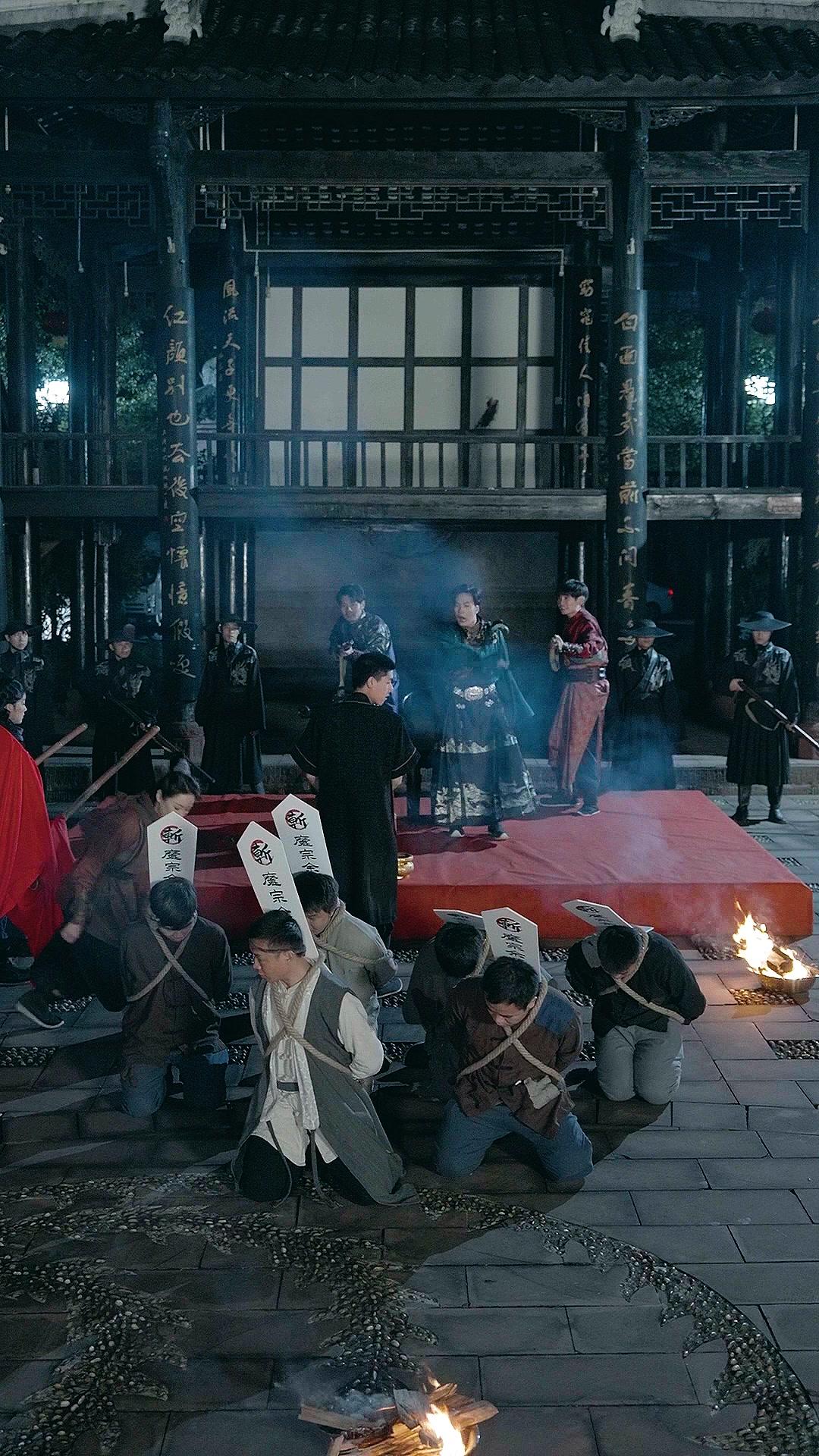 A surreal blend of ritual, gunplay, and absurd comedy—where a man in teal robes screams like a Shakespearean fool while others aim rifles from wicker baskets 🎯🔥 The red cloth, the rope, the moonlit courtyard… it’s not just action, it’s *performance*. Every frame feels staged yet spontaneous, like a folk opera hijacked by steampunk rebels. Pure cinematic chaos, and I’m here for it. 😂