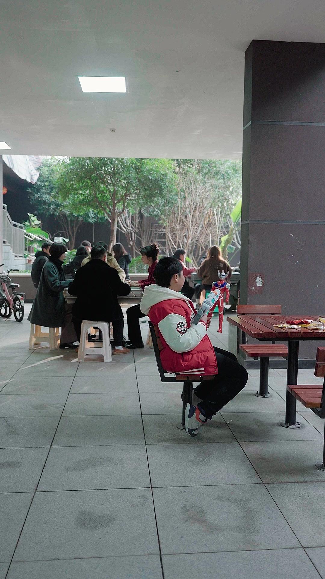In the opening frames of *Thief Under Roof*, we’re dropped into a seemingly ordinary communal courtyard—tiled floor, wooden benches, greenery peeking through the concrete frame—where life hums in low-frequency rhythms. A group of adults gathers around a mahjong table, their postures relaxed but their expressions tightly wound, like springs coiled beneath velvet. At the periphery sits Xiao Le, a boy no older than ten, clad in a red-and-white varsity jacket with oversized patches and a hood that barely contains his bowl-cut hair. He clutches a toy blaster—white, teal, orange-tipped—like it’s both shield and weapon. His eyes flick between the game and the world beyond, not bored, exactly, but *waiting*. Waiting for something to crack open.