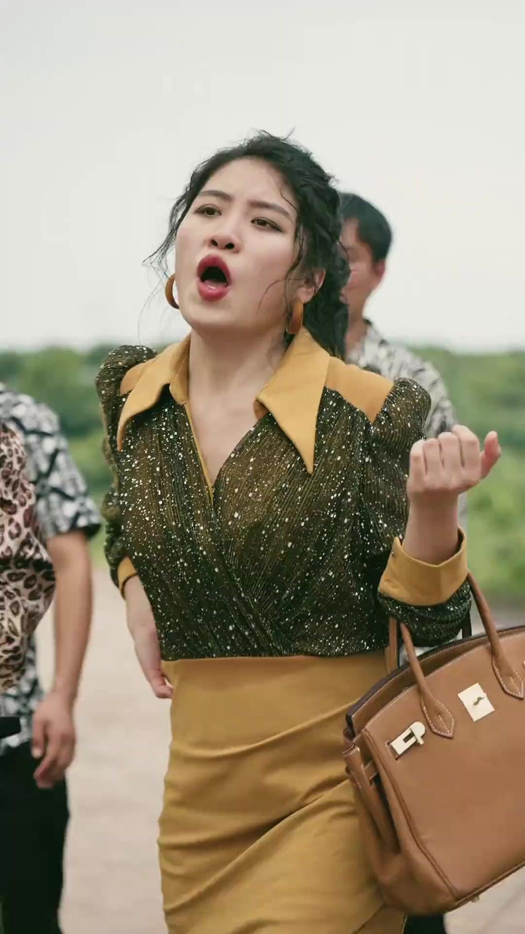 In the opening frames of *Through Thick and Thin*, we’re thrust into a rural setting where dust hangs in the air like unspoken tension—green hills loom in the background, but the real drama unfolds on cracked earth and weathered brick. A woman strides forward with purpose, her mustard-yellow skirt swaying, her blouse shimmering with tiny silver flecks that catch the sun like scattered coins. She carries a tan leather handbag—its hardware gleaming, its presence incongruous against the rustic backdrop. Her lips are painted bold red, her hair pulled back in a messy ponytail, strands escaping like rebellious thoughts. She’s not just walking; she’s *arriving*. And when she opens her mouth, the village holds its breath.