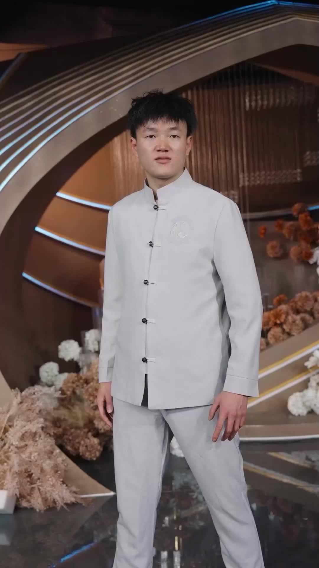 The opening shot—Li Wei standing center stage, arms relaxed, eyes steady—is deceptively calm. His outfit is minimalist elegance: light grey silk, black frog buttons, subtle embroidery near the collar. Behind him, the set design whispers luxury: curved gold panels, embedded blue LED ribbons like veins of electricity, dried florals arranged like ancient relics. It’s a space built for ceremony, not combat. Yet within two seconds, he’s thrusting his palms forward, and a vortex of white mist erupts—not smoke, not fog, but something *charged*, almost sentient, swirling around his fists as if obeying an unspoken command. His expression shifts from serene to strained, brows knitted, lips pulled back in a grimace that borders on comedic agony. That’s when we realize: this isn’t kung fu. It’s *kung fu with consequences*. Every motion has weight, every gesture risks collateral damage—and the audience, seated at round tables draped in ivory linen, watches with mouths agape, half-rising from their chairs, unsure whether to applaud or duck.