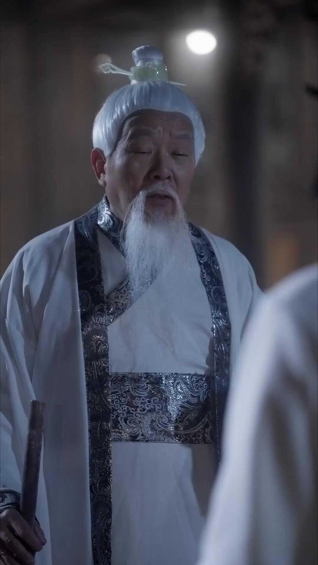 In the dim, mist-laden courtyard of what appears to be an ancient temple—its stone floor worn smooth by centuries, its eaves carved with serpentine motifs and faded vermilion lanterns swaying like ghosts—the tension doesn’t just simmer; it *breathes*. This isn’t a scene from some generic historical drama. It’s a moment where time itself seems to pause, caught between reverence and dread. At the center stands the Elder, his white hair coiled high with a jade hairpin that glints faintly under the single overhead bulb—a modern intrusion in an otherwise timeless setting. His robes are immaculate white, edged with silver brocade that catches the light like moonlight on rippling water. He holds a simple straw broom—not as a tool of labor, but as a symbol, perhaps even a weapon disguised as humility. His beard flows down his chest like a river of frost, and his eyes, though aged, hold the sharpness of a blade honed over decades of silent judgment.