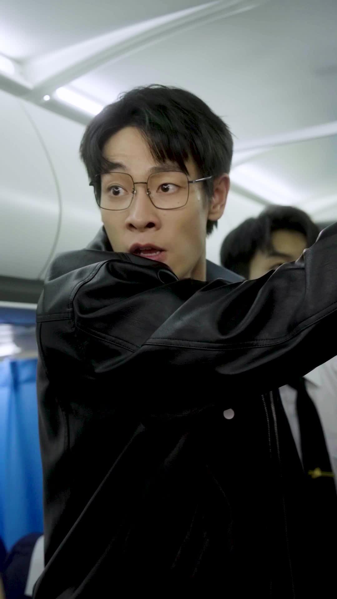 Let’s talk about the kind of in-flight chaos that doesn’t make it into airline safety videos—because no one scripts a scene where a man in a black leather jacket lunges toward the overhead bin like he’s trying to wrestle fate itself. In *Time Reversal: Emergency Rescue*, the opening minutes aren’t just tension—they’re a masterclass in spatial storytelling. The narrow aisle becomes a stage; the blue privacy curtains, a backdrop for emotional rupture. And at the center of it all? Li Wei, the bespectacled protagonist whose wide-eyed panic isn’t just fear—it’s recognition. He sees something we don’t yet, and his body reacts before his mind catches up. His arm shoots upward, fingers gripping the edge of the compartment as if holding back a floodgate. Behind him, Chen Xiao, the bald man in the olive bomber jacket, watches with eyes bulging like he’s just been handed a live grenade. His expression shifts from confusion to dawning horror in under two seconds—a micro-performance that deserves its own Oscar category.