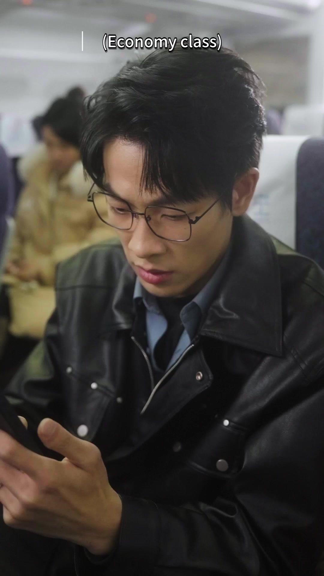 In the confined, softly lit cabin of a commercial aircraft—seat rows marked with the subtle logo of China Southern Airlines—a quiet tension simmers beneath the surface of routine travel. The protagonist, Lin Zeyu, sits in economy class, his black leather jacket slightly rumpled, his glasses perched low on his nose as he stares intently at his phone screen. Not scrolling. Not texting. Just watching. And what he’s watching is himself—his own face, captured in a video call that should have ended hours ago. The screen shows him standing in what appears to be an airport jet bridge, wearing the same outfit, speaking urgently, lips moving in sync with his present-day self’s silent mimicry. This isn’t a recording. It’s a loop. A recursive echo. Every time he looks away, the image flickers—like a glitch in reality—and when he returns his gaze, the version on the screen has advanced just enough to unsettle him further. His fingers twitch. His breath hitches. He glances left, where his companion, Shen Yiran, leans in, her expression shifting from curiosity to alarm. She wears a mustard tweed blazer with a Chanel brooch pinned precisely over the left lapel, her makeup immaculate but her eyes betraying unease. She doesn’t speak—not yet—but her hand rests lightly on his forearm, a gesture meant to ground him, though it only seems to amplify his disorientation.