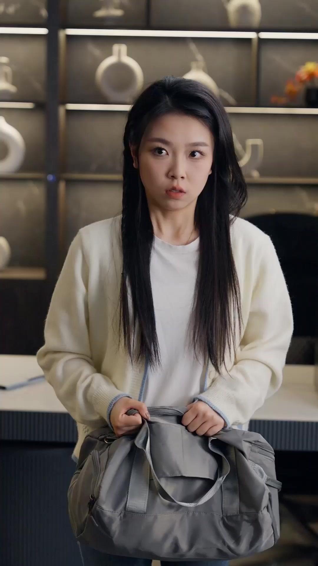 In the opening frames of *Time Won't Separate Us*, we’re dropped into a sleek, minimalist interior—marble floors, dark wood shelving, and curated ceramic vases that whisper wealth and control. But beneath this polished surface, tension simmers like steam trapped in a sealed jar. Coco Laurent stands center frame, gripping a gray duffel bag with white-knuckled intensity. Her long black hair is parted down the middle, two thin braids framing her face like ribbons of restraint. She wears a cream cardigan over a plain white tee, jeans, and white sneakers—casual, almost defiantly ordinary against the opulence surrounding her. Yet her eyes betray everything: wide, darting, lips slightly parted as if she’s just heard something that rewired her nervous system. This isn’t just a girl holding a bag. This is a woman standing at the edge of a precipice, unsure whether to jump—or push someone else off first.