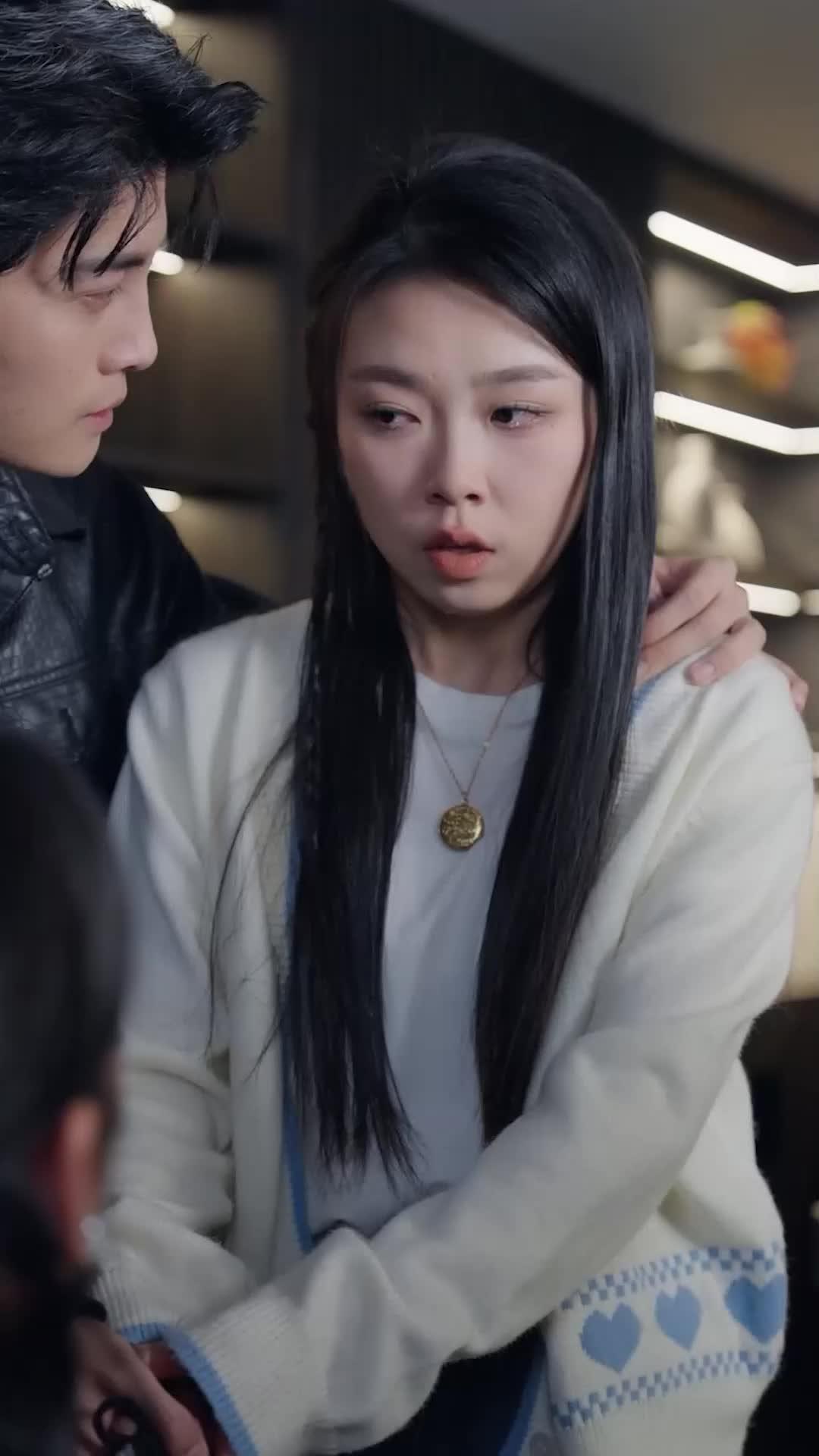 In the tightly framed, emotionally charged sequence from *Time Won't Separate Us*, we witness a domestic crisis that unfolds like a slow-motion car crash—inevitable, visceral, and deeply human. The opening shot lingers on Lin Xiao, her face caught between shock and sorrow, eyes wide but not yet spilling tears, as Chen Wei’s hand rests heavily on her shoulder—not comfort, but containment. She wears a cream cardigan with blue hearts stitched along the hem, a garment that screams innocence, youth, vulnerability; yet her posture is rigid, her fingers interlaced in front of her like she’s bracing for impact. This isn’t just a scene—it’s a psychological threshold. Behind her, the modern interior—sleek marble floors, recessed LED strips, minimalist shelving—feels cold, almost clinical, as if the architecture itself is judging the emotional chaos erupting within its walls.