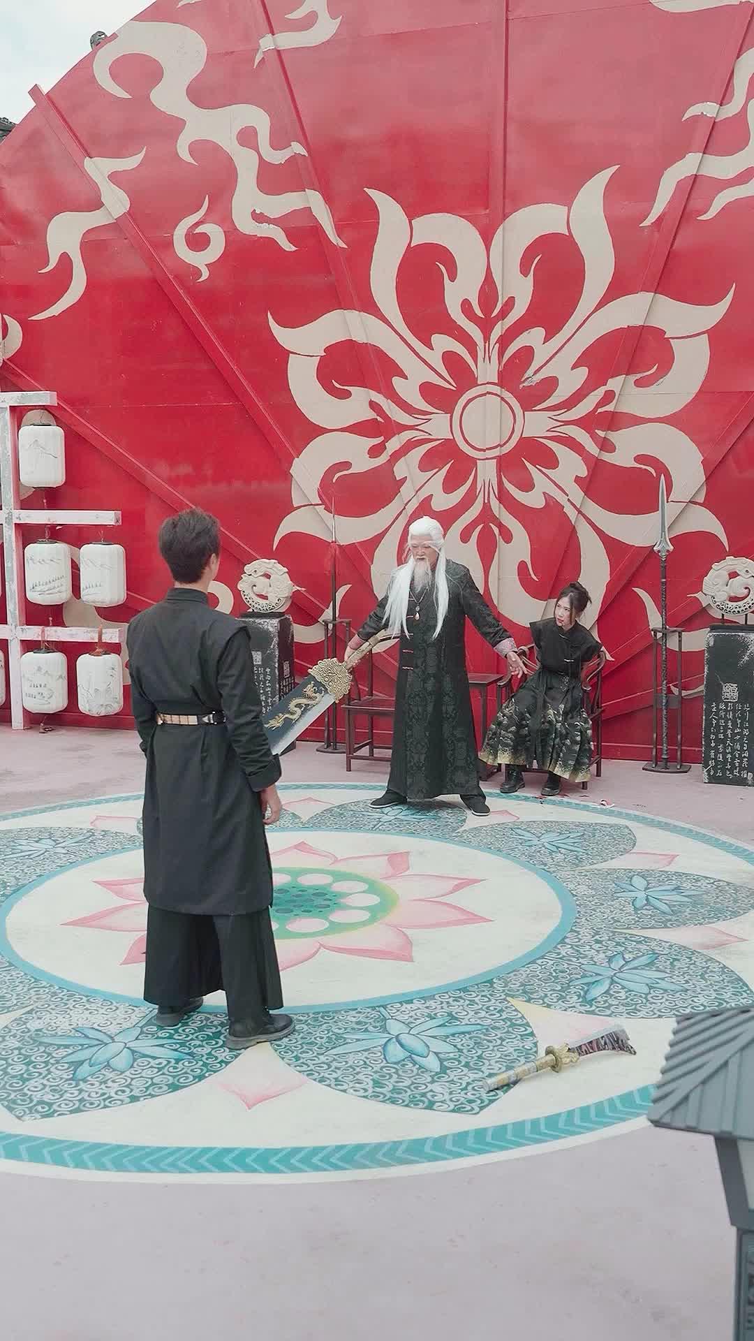 The opening shot of *To Forge the Best Weapon* drops us straight into a courtyard that feels less like a set and more like a sacred arena—where every tile, every lantern, and every swirl of red-and-white floral motif on the towering backdrop whispers of fate already sealed. At its center stands Li Chen, his back to the camera, dressed in a black robe embroidered with silver-and-gold phoenixes that seem to writhe with latent energy. His posture is rigid—not out of fear, but restraint. He knows what’s coming. Across from him, seated on a carved wooden chair, is Elder Mo, white hair cascading past his waist like frozen river mist, beard thick and immaculate, eyes half-lidded yet sharp enough to cut through illusion. Beside him, bound by rope and trembling, is Xiao Yue—her face smudged with dirt and blood, her silk sleeves torn, revealing raw skin beneath. She doesn’t scream. She breathes in short, broken gasps, as if trying to memorize the sound of her own pulse before it stops. A sword lies discarded near the edge of the lotus-patterned floor—a symbol not of victory, but of surrender. This isn’t just a confrontation; it’s a ritual. And Li Chen is the reluctant priest.
